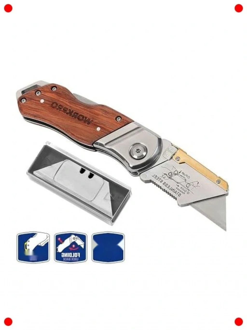 Ağır hizmet tipi katlanır maket bıçağı, paslanmaz çelik ve ahşap gövyle dayanıklılık ve şık bir görünümü bir araya getiriyor. Güvenli katlanabilir mekanizması sayesinde cebinizde veya alet çantanızda güvenle taşıyabilirsiniz. Keskin bıçağı ile karton, halı, kumaş, ip gibi birçok malzemeyi rahatlıkla kesebilirsiniz. El işi, hobi, kutu açma, marangozluk gibi çeşitli işler için idealdir. Yanında gelen 10 adet yedek bıçak ile uzun süreli kullanım imkanı sunarak keskinliğinizden ödün vermeden jelerinize devam etmenizi sağlar. Güvenilir ve çok yönlü bir kesim aracıdır.