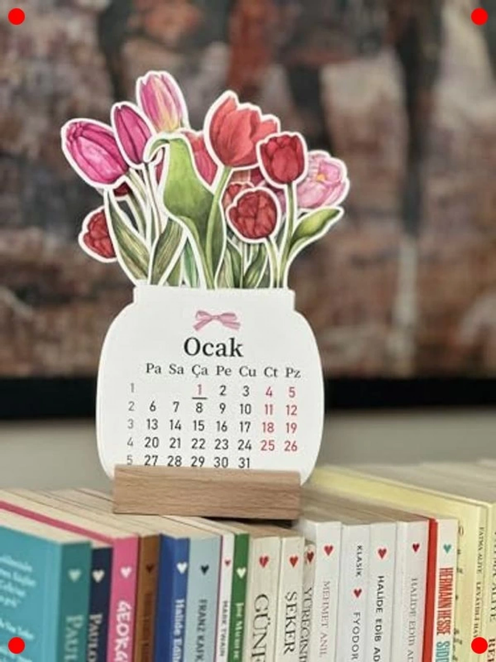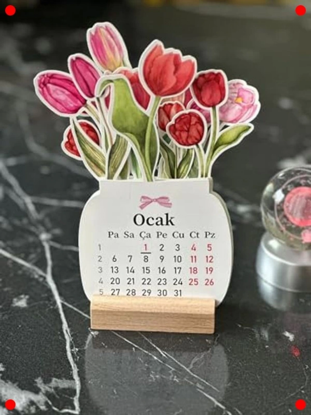 2026 yılını şık bir başlangıçla karşılayın! Bu özel tasarım mini masa takvimi, lale çiçek buketi motifleriyle masanıza zarif bir dokunuş katıyor. Doğal ahşap ayakları sayesinde sağlam ve estetik bir duruş sergilerken, kompakt boyutuyla çalışma masanızda veya ofisinizde az yer kaplar. Yıl boyunca önemli tarihleri, randevuları ve notlarınızı kolayca takip etmenizi sağlar. Sevdikleriniz için anlamlı bir yeni yıl hediyesi veya kendi kullanımınız için dekoratif ve fonksiyonel bir üründür. Her ay farklı bir lale kompozisyonu ile ilham verici bir görünüm sunar.