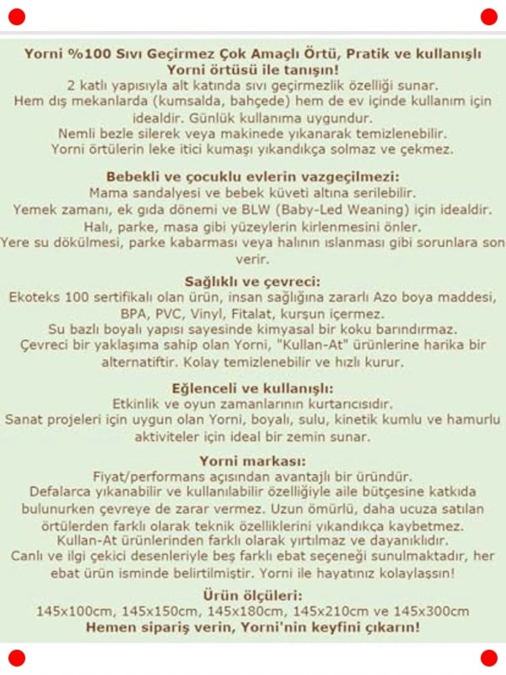 Çok yönlü ve pratik bu su geçirmez örtü ile aile aktivitelerinizi daha konforlu hale getirin. 150x150 cm boyutuyla hem yer örtüsü hem de masa örtüsü olarak kullanılabilir. Yemek saatlerinden oyun seanslarına, pikniklerden el işi çalışmalarına kadar birçok alanda size kolaylık sağlar. Suyu ve lekeleri tutmayan özel yapısı sayesinde kolayca temizlenir ve uzun ömürlü kullanım sunar. Ekoteks sertifikalı, doğa dostu ve çevreci malzemelerden üretilmiştir, böylece hem aileniz hem de çevre için güvenlidir. Portatif tasarımıyla her yere rahatça taşınabilir.