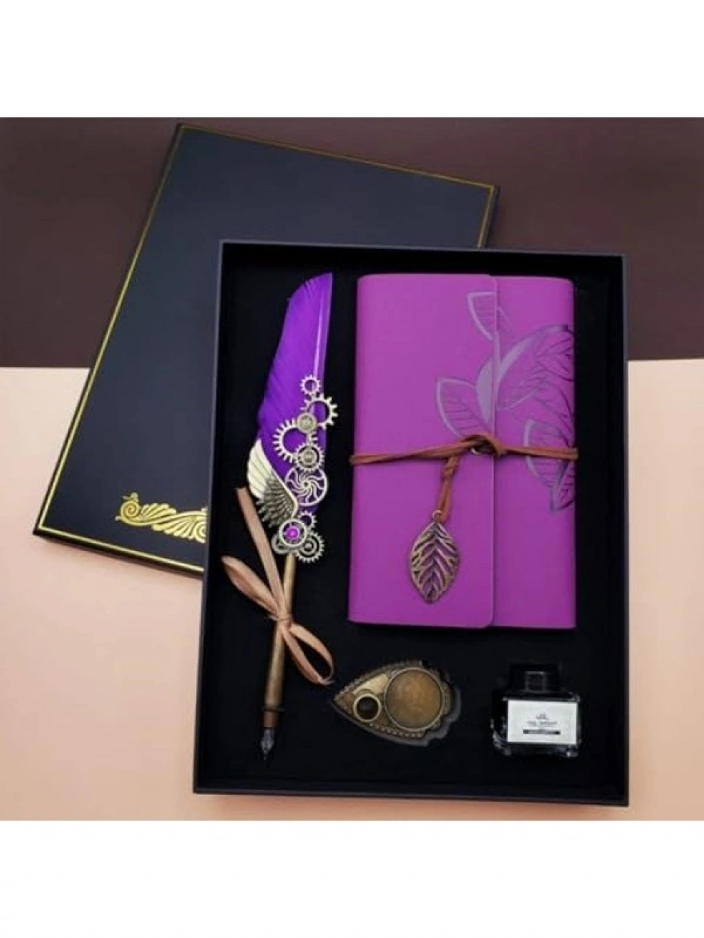 Özel tasarıma sahip ajanda ve divit kalem seti, vintage görünümü ile dikkat çekmektedir. Tüylü kalem ve deri kaplamalı defter seti, hem estetik hem de işlevsellik açısından öne çıkar. Kalem, koyu rengiyle zarif bir görünüm sunarken, defterin yaprak tasarımı hediyeyi daha da özel kılar. Bu set, hem çocuklar hem de yetişkinler için mükemmel bir hediye alternatifi olarak ön plana çıkmaktadır.