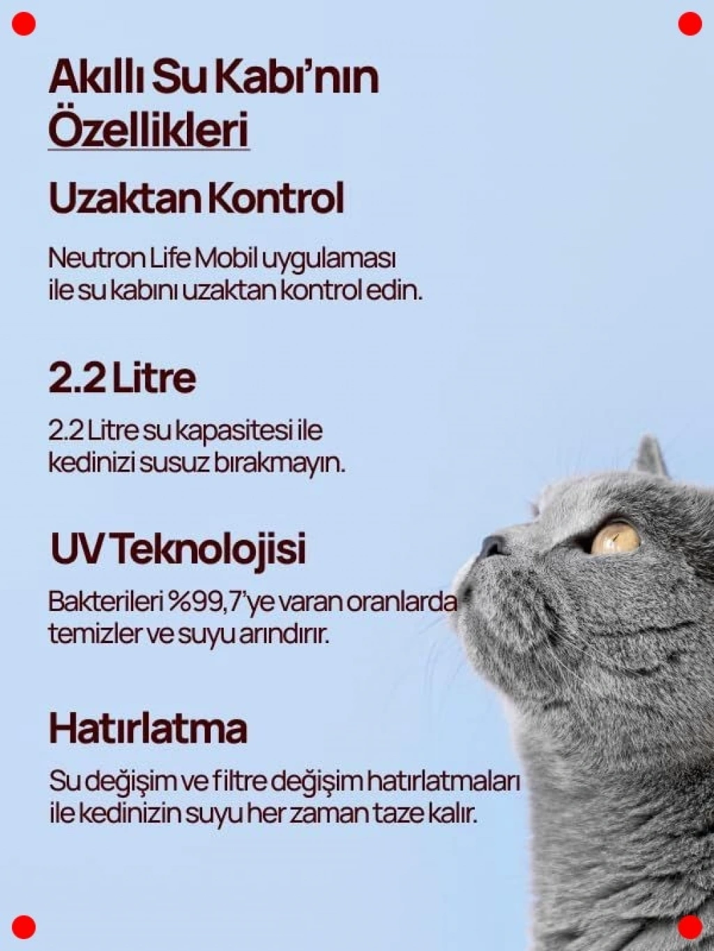 Evcil hayvanınızın her zaman taze ve temiz suya erişmesini sağlayan bu akıllı su pınarı, UV sterilizasyon teknolojisi ile suyu mikroplardan arındırır. Wi-Fi ve Bluetooth desteği sayesinde uygulama üzerinden su seviyesini takip edebilir, çalışma programını ayarlayabilir ve filtre ömrünü yönetebilirsiniz. Sessiz çalışma özelliği sayesinde evinizin huzurunu bozmaz. Sürekli dolaşan su, evcil hayvanınızı daha fazla su içmeye teşvik eder, böylece böbrek sağlığını destekler.