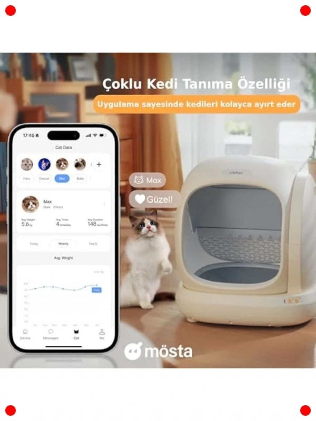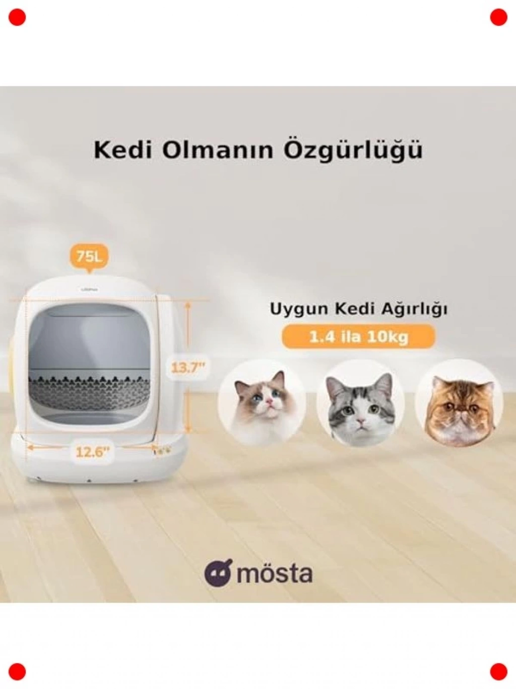 Evcil hayvanınız için tasarlanmış akıllı kedi tuvaleti ile hijyen ve konforu bir arada yaşayın. Mobil uygulama üzerinden kontrol edilebilir, böylece tuvaletin temizlik döngüsünü dilediğiniz zaman yönetebilirsiniz. Otomatik temizleme özelliği, kürek kullanma zahmetini ortadan kaldırır. Çift deodorant sistemi sayesinde kötü kokuları etkili bir şekilde nötralize eder ve evinizde taze bir hava sağlar. Sadece 38dB'lik sessiz çalışma özelliği ve ağırlık sensörü ile evcil dostunuzun konforunu ön planda tutar.