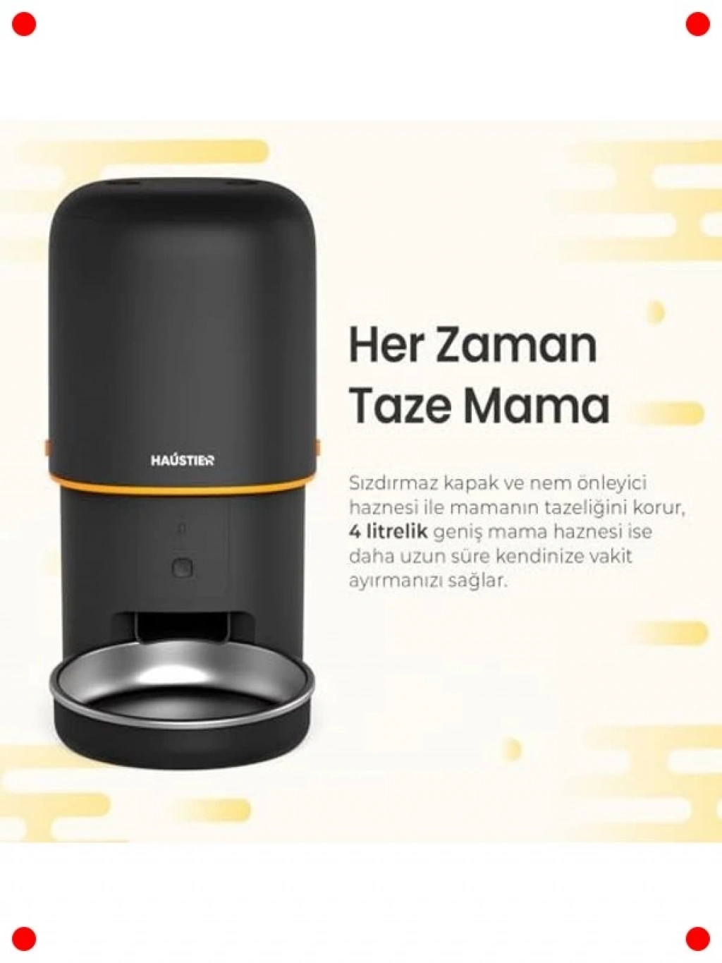 Evcil hayvanınızın beslenme düzenini sizin yokluğunuzda bile aksatmadan sürdürmek için tasarlanmış bu akıllı otomatik mama kabı, Wi-Fi bağlantısı sayesinde cep telefonunuzdan uzaktan kolayca kontrol edilebilir. 4 litrelik geniş mama haznesi, uzun süreli mama depolama kapasitesi sunar, böylece sık sık doldurma ihtiyacını ortadan kaldırır. Paslanmaz çelik mama kasesi, hijyenik ve sağlıklı bir beslenme ortamı sağlarken, kolay temizlenebilir özelliğiyle de pratik bir kullanım sunar. Belirlediğiniz programlara göre otomatik mama dağıtımı yaparak evcil hayvanınızın düzenli beslenmesini garanti eder. Sesli kayıt özelliği ile yemek zamanı dostunuzu çağırabilir, onunla uzaktan iletişim kurabilirsiniz. Şık siyah rengiyle modern ev dekorasyonlarına uyum sağlar.