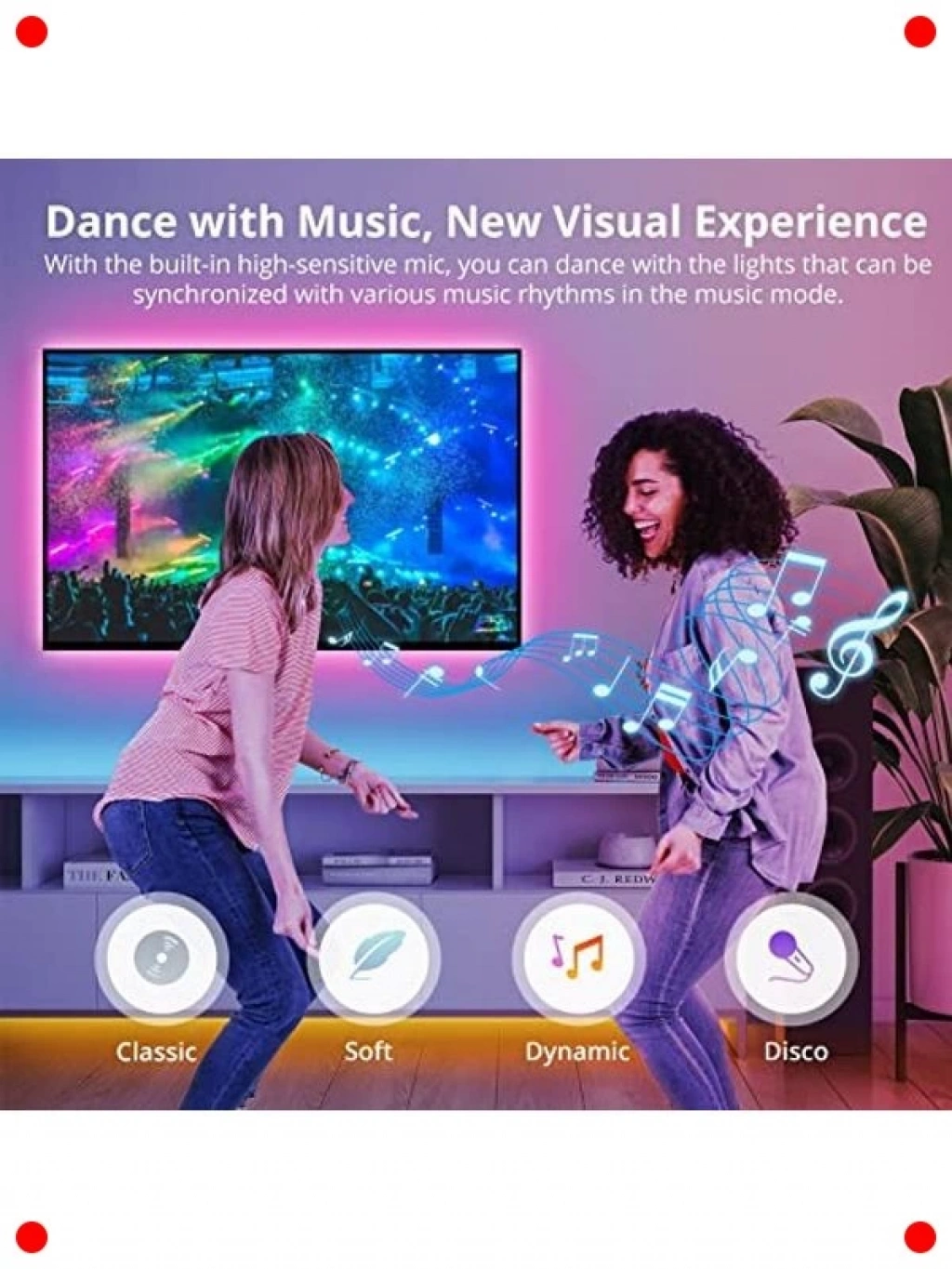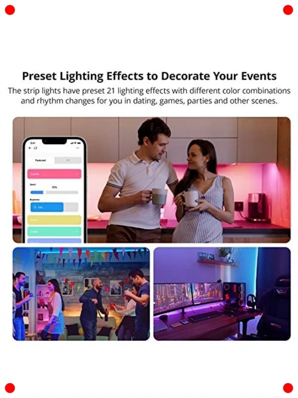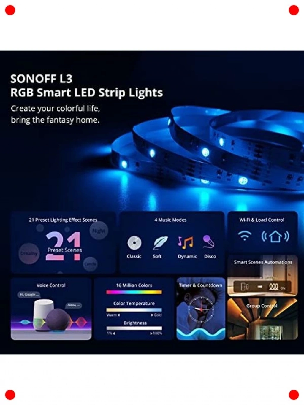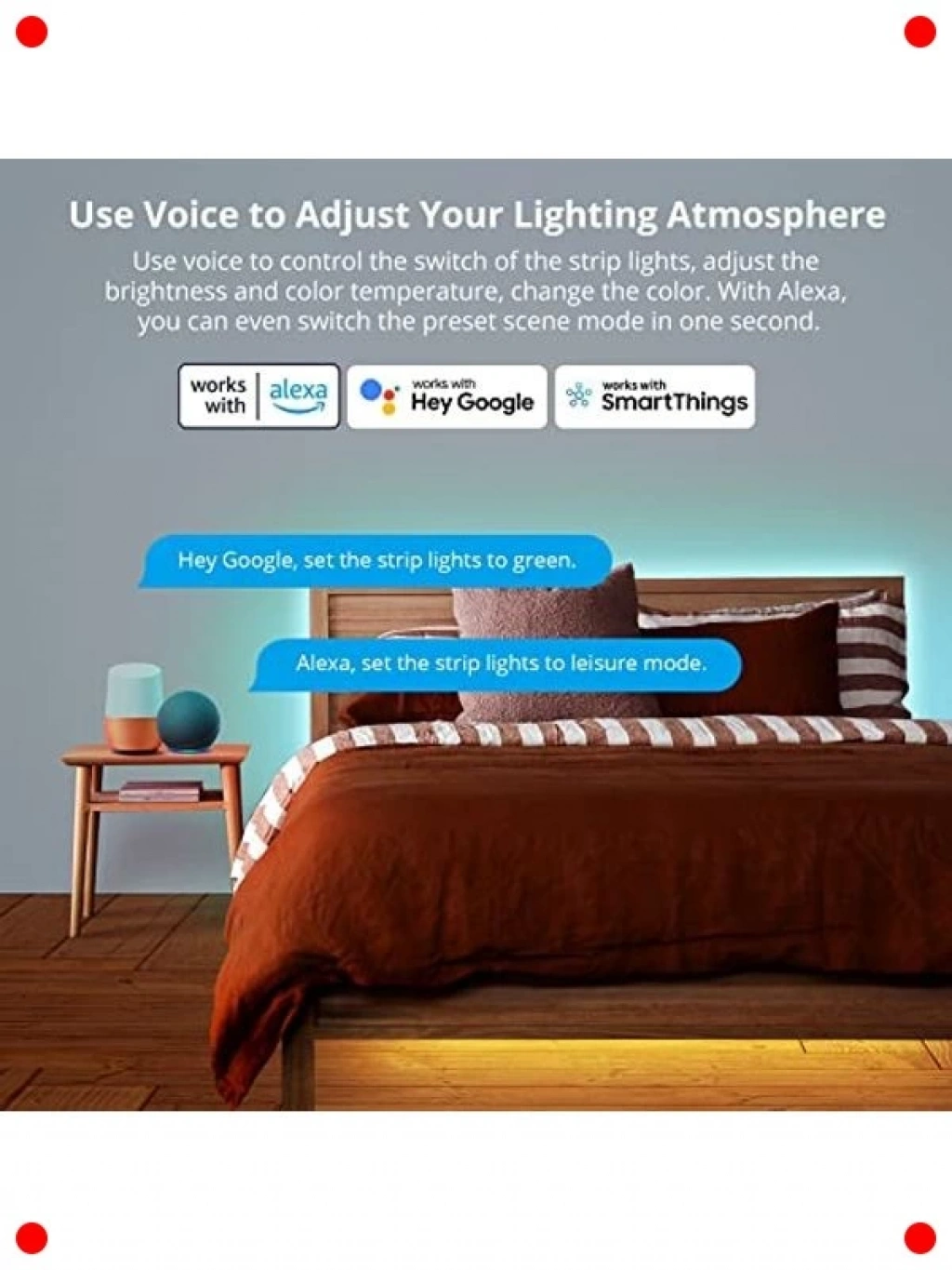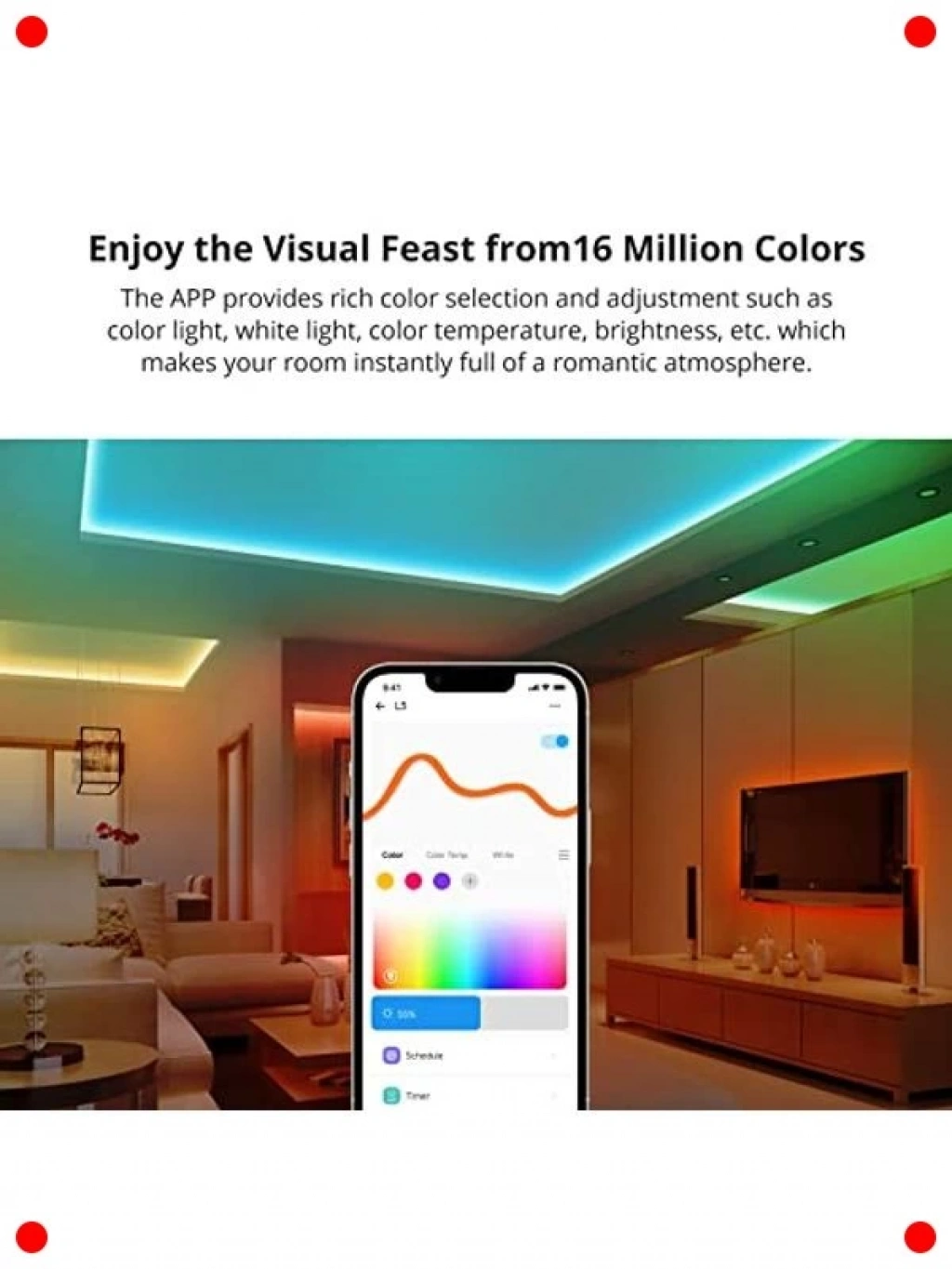 Yatak odanızda veya diğer yaşam alanlarınızda modern ve dinamik bir ambiyans yaratmak için tasarlanmış bu akıllı WiFi RGB LED şerit ışıklar, 5 metre uzunluğuyla geniş bir alanı kapsar. 5050 tipi LED'ler sayesinde canlı ve zengin renkler sunar, ruh halinize veya etkinliğinize göre ışık rengini kolayca değiştirebilirsiniz. Akıllı telefon uygulaması üzerinden veya sesli asistanlar ile kontrol edilebilir olması, kullanım kolaylığı sağlar. Müzik senkronizasyonu gibi özel modlarla partilerinize renk katın veya rahatlatıcı bir atmosfer yaratın. Kurulumu basit olup, esnek yapısıyla her yüzeye kolayca uygulanabilir.