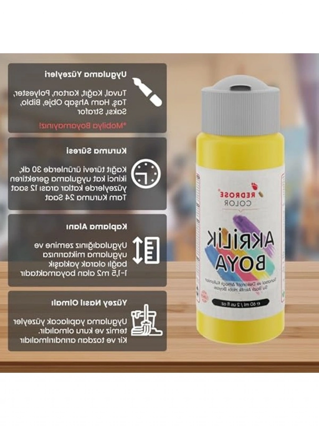 Sarı renkli akrilik boya, 60 ml hacminde kullanıma sunulmuştur. Yüksek kaliteli malzemelerle üretilmiş olup, sanatsal projelerinizde canlı bir görünüm sağlamak için idealdir. Hızla kuruyan yapısı sayesinde, çizim ve boyama süreçlerinizi hızlandırır. Farklı yüzeylerde uygulanabilir olması, çok yönlü bir kullanım alanı sağlar.