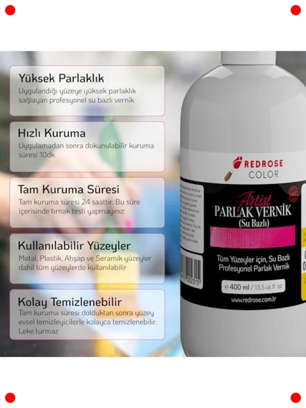 Sanatsal projelerinize ve el işlerinize profesyonel bir dokunuş katmak için tasarlanmış bu 400 ml akrilik su bazlı parlak vernik sprey ile eserlerinizi koruyun ve parlaklığını artırın. Çabuk kuruyan formülü sayesinde işlerinizi hızla tamamlayabilir, su bazlı yapısı ile kolayca temizlenebilir. Ahşap, metal, karton, taş ve birçok farklı yüzeyde kullanılabilir. Uygulandığı yüzeye şeffaf ve dayanıklı bir parlaklık kazandırırken, aynı zamanda dış etkenlere karşı koruma sağlar. Sanatçıların, hobi tutkunlarının ve DIY projeleriyle uğraşan herkesin vazgeçilmezi olacak bu ürün, eserlerinize uzun ömürlü bir güzellik katar. Kullanımı kolay ve çevre dostu bir çözümdür.