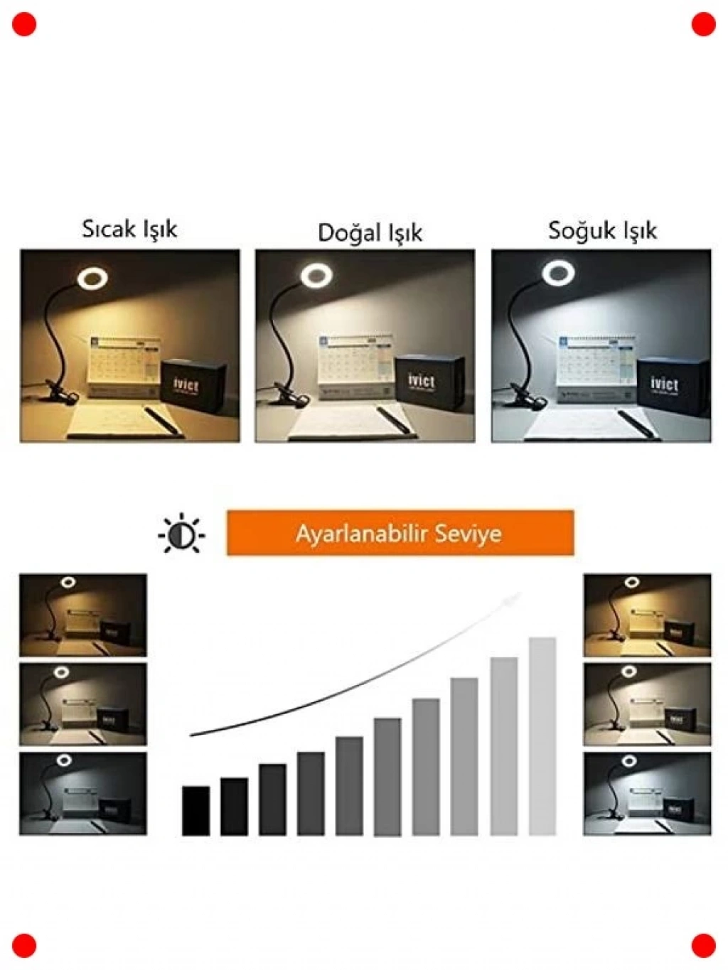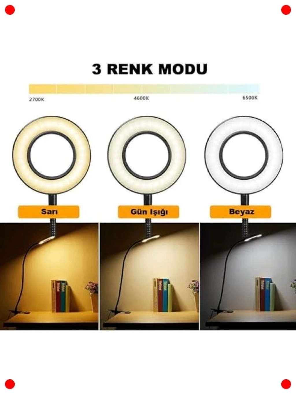 Çok yönlü kullanım imkanı sunan bu akrobat klipsli LED masa lambası, çalışma alanınıza veya yaşam alanınıza işlevsel bir aydınlatma çözümü getirir. Esnek akrobat kolu sayesinde ışığı istediğiniz yöne kolayca ayarlayabilir, klipsli tabanıyla masa, raf veya yatak başlığı gibi farklı yüzeylere sabitleyebilirsiniz. Göz koruyucu LED teknolojisi sayesinde uzun süreli kullanımlarda bile göz yorgunluğunu minimize eder. Üç farklı ışık modu (sarı, beyaz, gün ışığı) ve ayarlanabilir parlaklık seviyeleri ile her ihtiyaca uygun atmosferi yaratır. Kitap okuma, ders çalışma, makyaj yapma veya video çekimi (Ring Light etkisi) gibi birçok aktivite için idealdir. Enerji verimli ve uzun ömürlü bir aydınlatma sağlar.