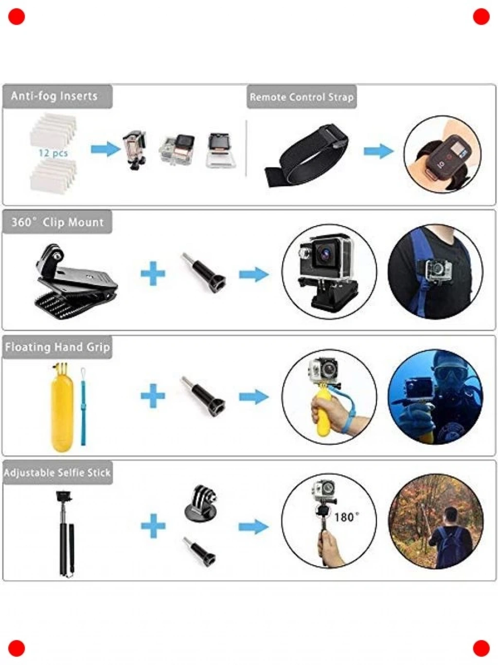 Aksiyon kameranızla çekim deneyiminizi bir üst seviyeye taşımak için ihtiyacınız olan her şey bu kapsamlı 50 parçalık aksesuar setinde! Farklı çekim açılarında ve çeşitli aktivitelerde kullanabileceğiniz montaj aparatları, bağlantı parçaları ve sabitleyiciler içerir. Kasktan bisiklete, göğüsten bileğe kadar her yüzeye ve vücut kısmına kolayca takılabilir. Kaliteli malzemelerden üretilen bu aksesuarlar, kameranızın güvende kalmasını sağlar. Vlog çekimleri, spor aktiviteleri, seyahatler ve macera dolu anlarınız için idealdir. Özel taşıma çantası sayesinde tüm parçaları düzenli ve güvenli bir şekilde saklayabilir, istediğiniz yere kolayca taşıyabilirsiniz.