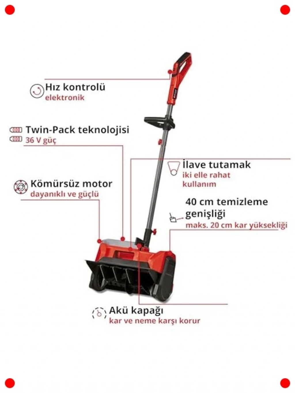 Kış aylarında kar temizleme işinizi kolaylaştıran bu güçlü akülü kar püskürtme makinesi, kablosuz çalışma özgürlüğü sunar. 36V Li-Ion teknolojisi sayesinde yüksek performans ve uzun çalışma süresi sağlar. 40 cm'lik çalışma genişliği ile geniş alanları hızla temizlerken, maksimum 20 cm kar yüksekliğine kadar etkili sonuçlar verir. Hafif ve manevra kabiliyeti yüksek tasarımı ile kullanımı oldukça pratiktir. Akü ve şarj cihazı ayrı satılmaktadır, bu sayede mevcut akü sisteminizi kullanabilir veya ihtiyacınıza göre ekleme yapabilirsiniz. Kışın vazgeçilmez yardımcınız olacak.