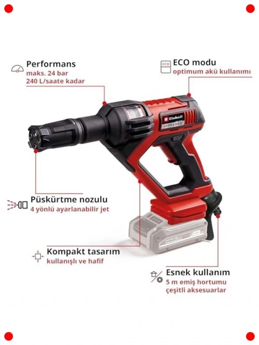 Kablosuz özgürlükle temizliğin ve sulamanın keyfini çıkarın! Bu akülü basınçlı yıkama tabancası, 18V gücüyle 24 bara kadar etkili bir basınç sunar. Kirli yüzeyleri, araçları veya bahçe mobilyalarını kolayca temizleyebilir, aynı zamanda bitkilerinizi nazikçe sulayabilirsiniz. Saatte 240 litre su akışıyla verimli bir kullanım sağlar. Kompakt ve hafif tasarımı sayesinde her yere rahatça taşıyabilir ve kullanabilirsiniz. Birlikte verilen aksesuarlar, farklı ihtiyaçlarınıza uygun çözümler sunar. Bahçe ve ev çevresi temizliğiniz için çok yönlü bir yardımcıdır.