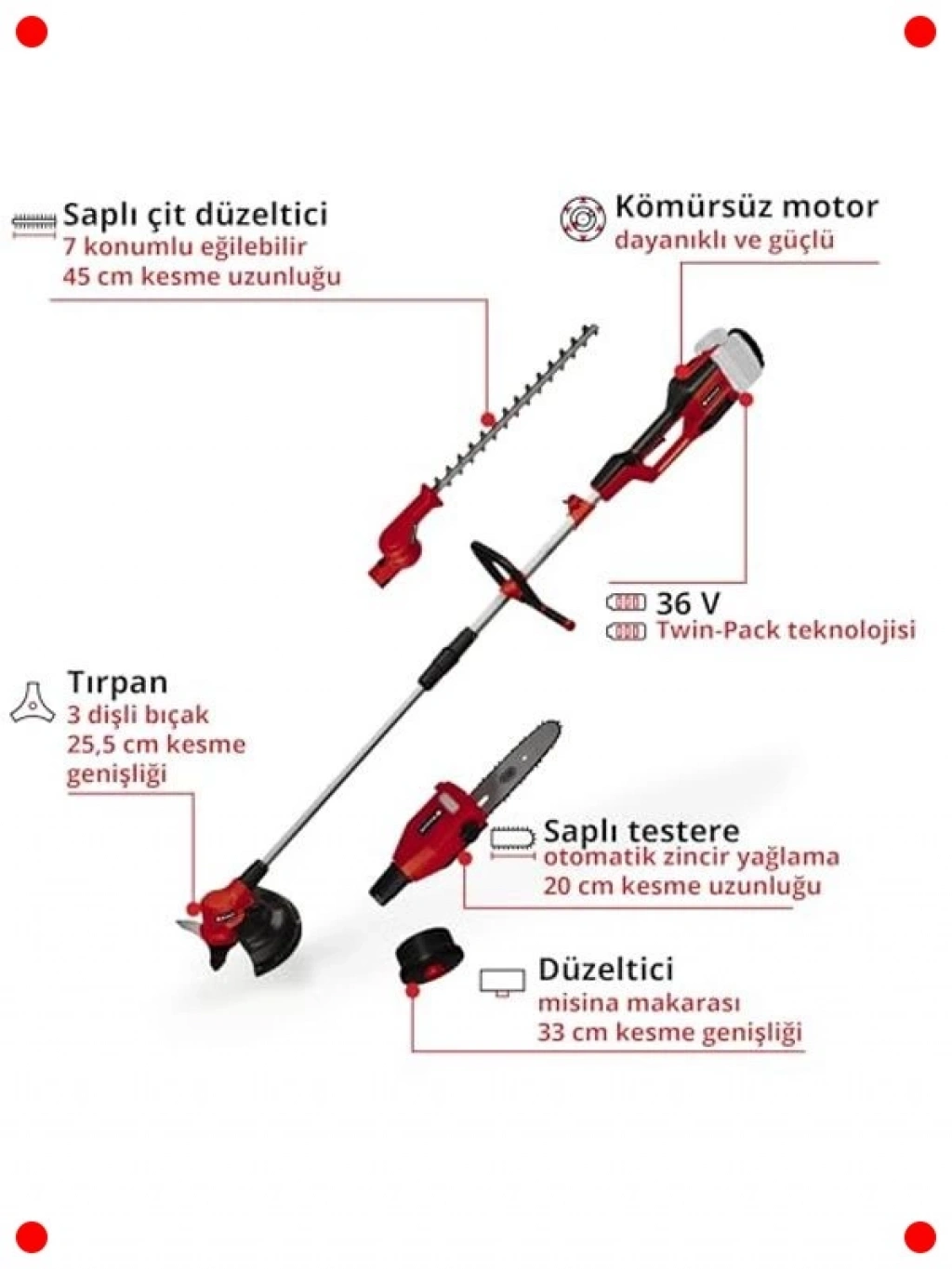 Bahçe bakımınız için tek bir alette dört farklı işlevi bir araya getiren bu akülü çok fonksiyonlu set ile tanışın. Çit budama, uzun saplı dal kesme, çim biçme ve çalı kesme gibi temel bahçe görevlerini tek bir güç ünitesiyle halledin. Kablosuz yapısı sayesinde özgürce hareket edebilir, elektrik prizi arama derdinden kurtulursunuz. Hafif ve ergonomik tasarımı, uzun süreli kullanımlarda bile konforlu bir deneyim sunar. Farklı aparatları kolayca değiştirilebilir, böylece işler arasında hızlıca geçiş yapabilirsiniz. Akü ve şarj cihazı ayrı satılmakta olup, mevcut akülü sisteminizle uyumludur. Tüm bahçe işleriniz için pratik ve güçlü bir çözümdür.