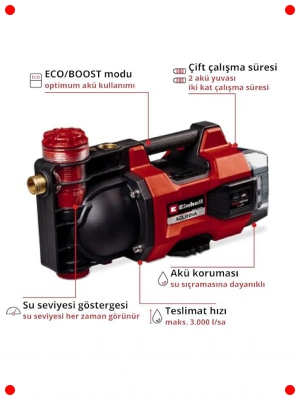 Bahçenizde kablo derdi olmadan özgürce sulama yapın! 18V akülü taşınabilir bahçe pompası, maksimum 3000 L/saat su aktarımı kapasitesiyle verimli bir performans sunar. İki akü yuvası sayesinde çift çalışma süresi elde edebilir, geniş alanları kesintisiz sulayabilirsiniz. ECO ve BOOST modları, güç ve verimlilik arasında seçim yapma imkanı sunar. Entegre ön filtre, pompanın ömrünü uzatır ve tıkanmaları önler. Yağmur suyu bidonlarından veya su depolarından sulama yapmak için idealdir. Bahçeniz için güçlü, esnek ve çevre dostu bir sulama çözümü.