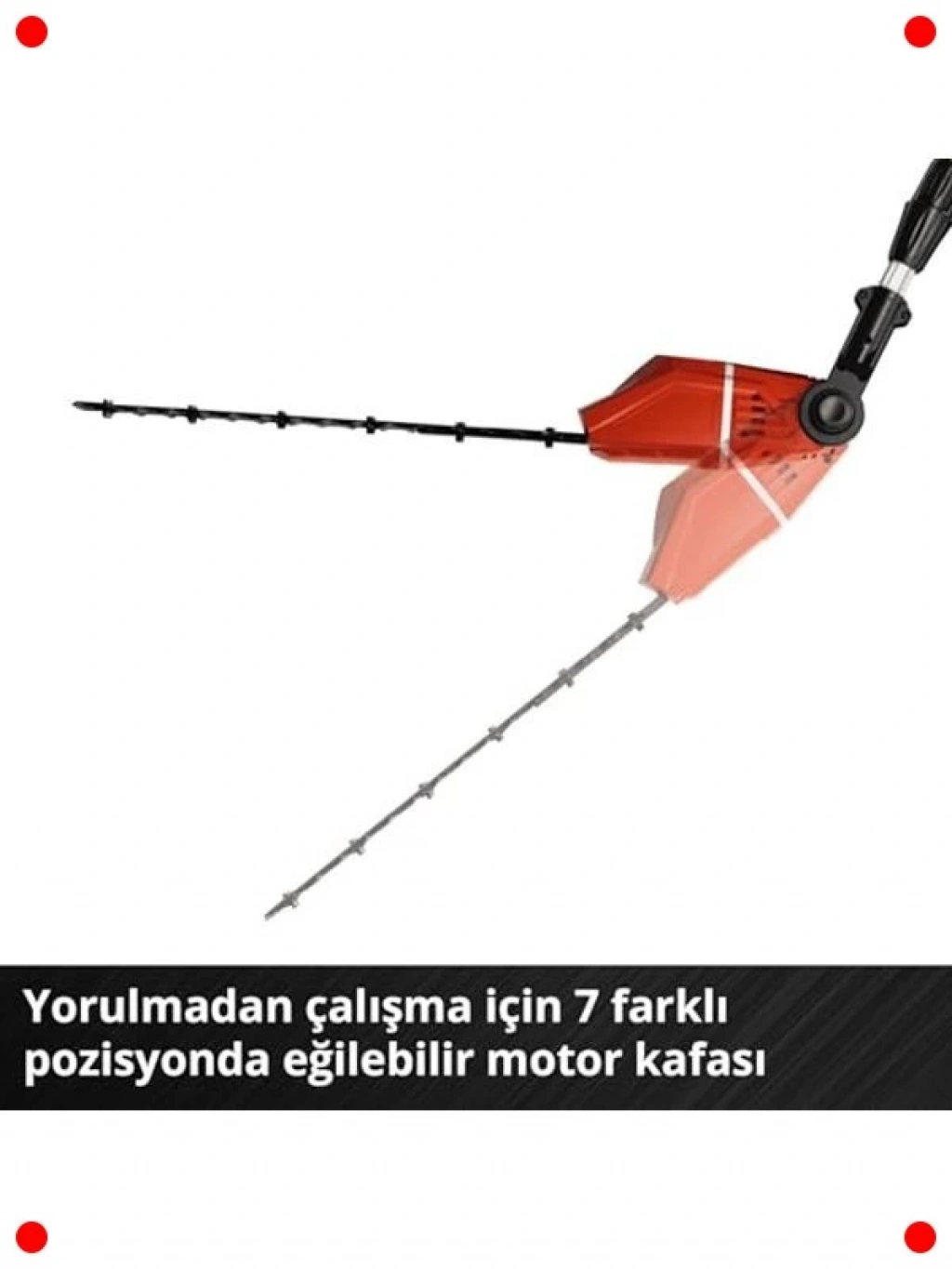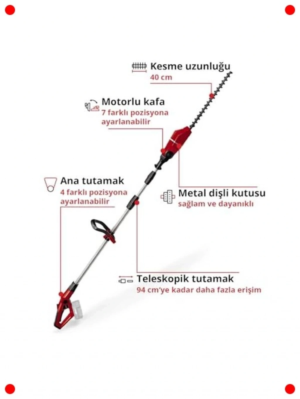 Yüksek ve ulaşılması zor çitleri budamak artık çok daha kolay! Bu akülü uzun saplı çit budama makinesi, 45 cm kılavuz uzunluğuna sahip elmas bilemeli çelik bıçaklarıyla keskin ve verimli budama sağlar. 18V Li-Ion uyumlu akü sistemi sayesinde kablosuz hareket özgürlüğü sunar (akü ve şarj cihazı ayrı satılır). Hafif ve dengeli tasarımı, uzun süreli kullanımlarda bile yorgunluğu azaltır. Bahçenizde mükemmel şekiller elde etmek için ideal bir araçtır.