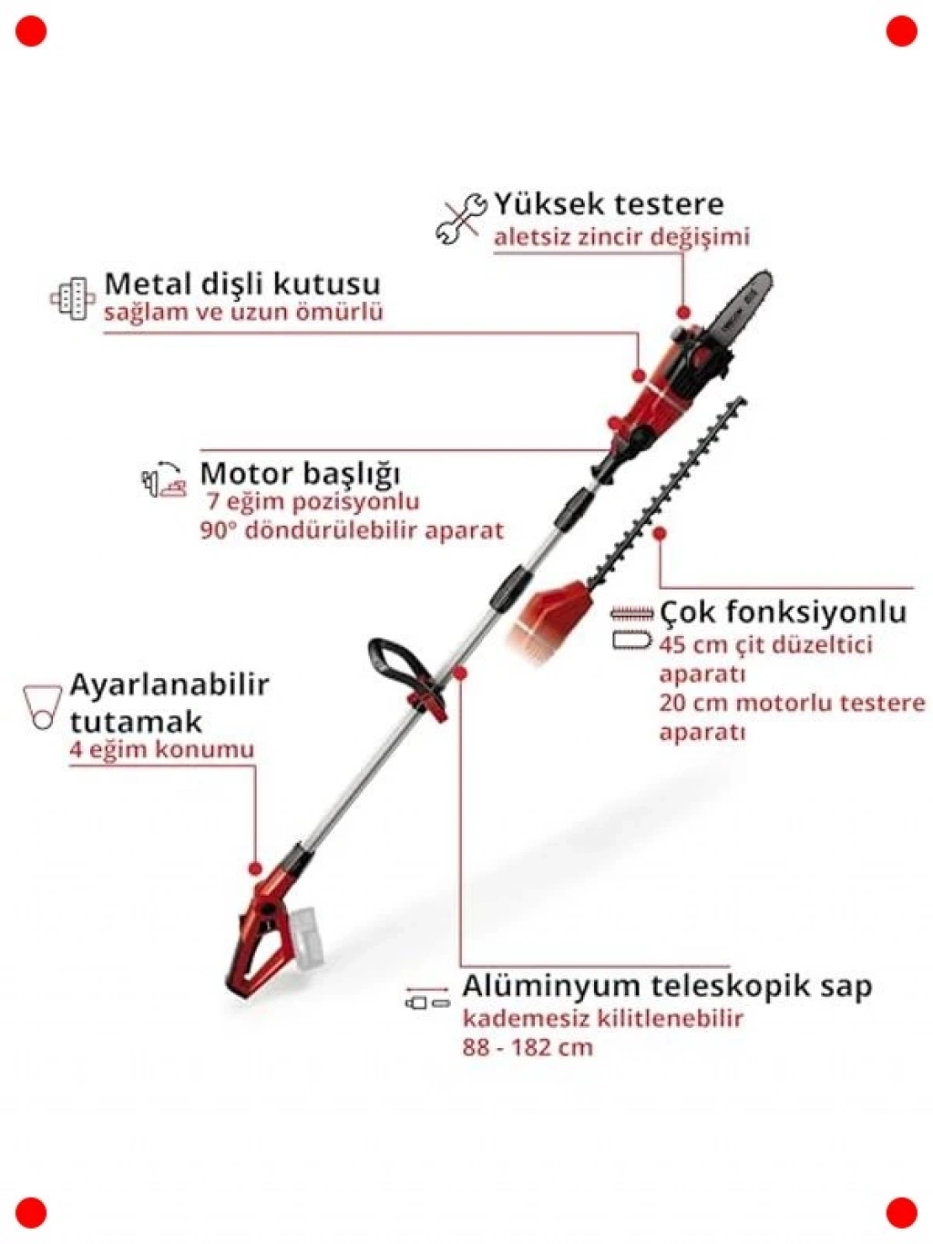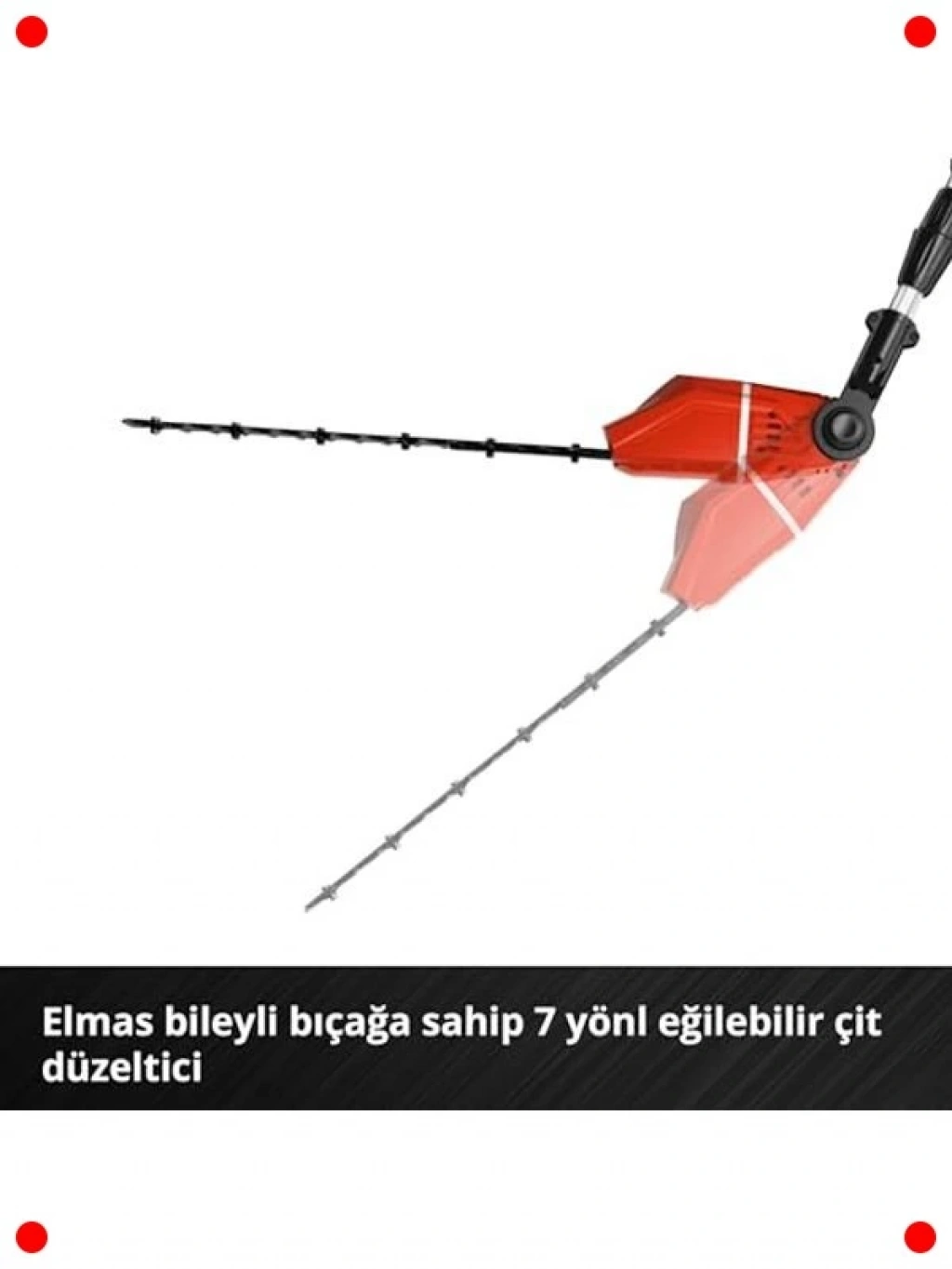 Bahçenizdeki yüksek dallara ve zorlu çitlere kolayca ulaşmak için tasarlanmış bu akülü budama makinesi ile kabloların kısıtlamasından kurtulun. Güçlü akü sistemi (akü dahil değildir) sayesinde kesintisiz ve verimli çalışma imkanı sunar. 7 kademeli ayarlanabilir eğim başlığı, ergonomik bir duruşla farklı açılarda budama yapmanızı sağlar. Hafif ve dengeli yapısı, uzun süreli kullanımlarda bile yorgunluğu azaltır. Keskin bıçakları sayesinde temiz ve hızlı kesimler yaparak bitkilerinizin sağlıklı büyümesini destekler. Güvenlik özellikleri ile kullanıcı konforunu ön planda tutar ve bahçe bakımınızı kolaylaştırır.