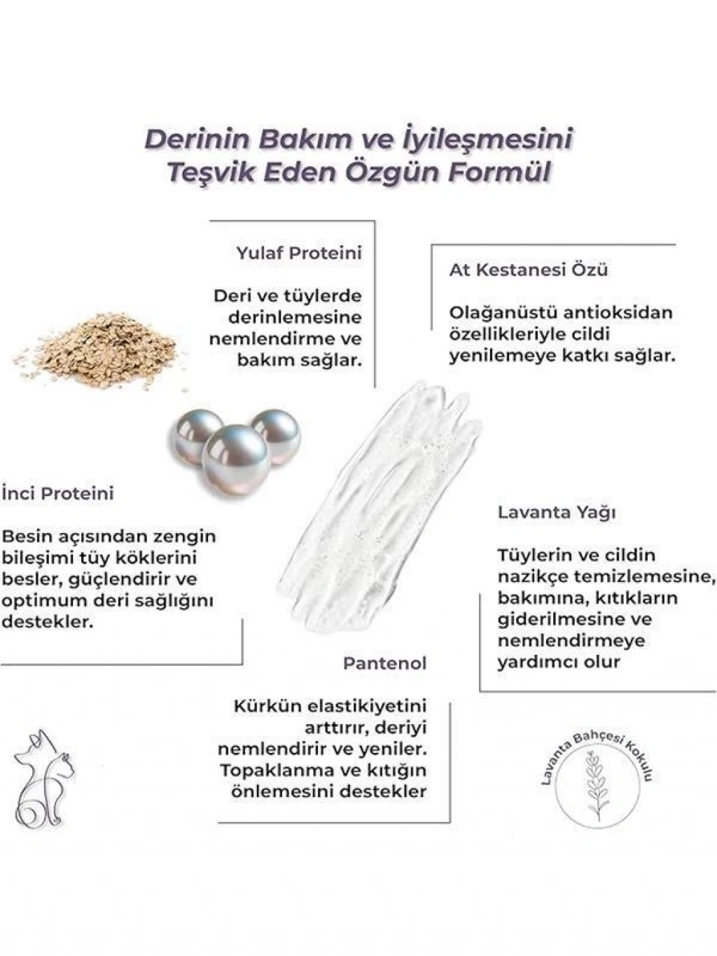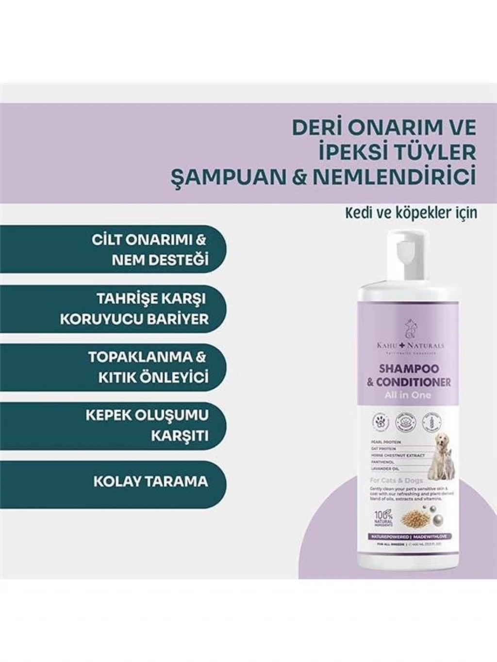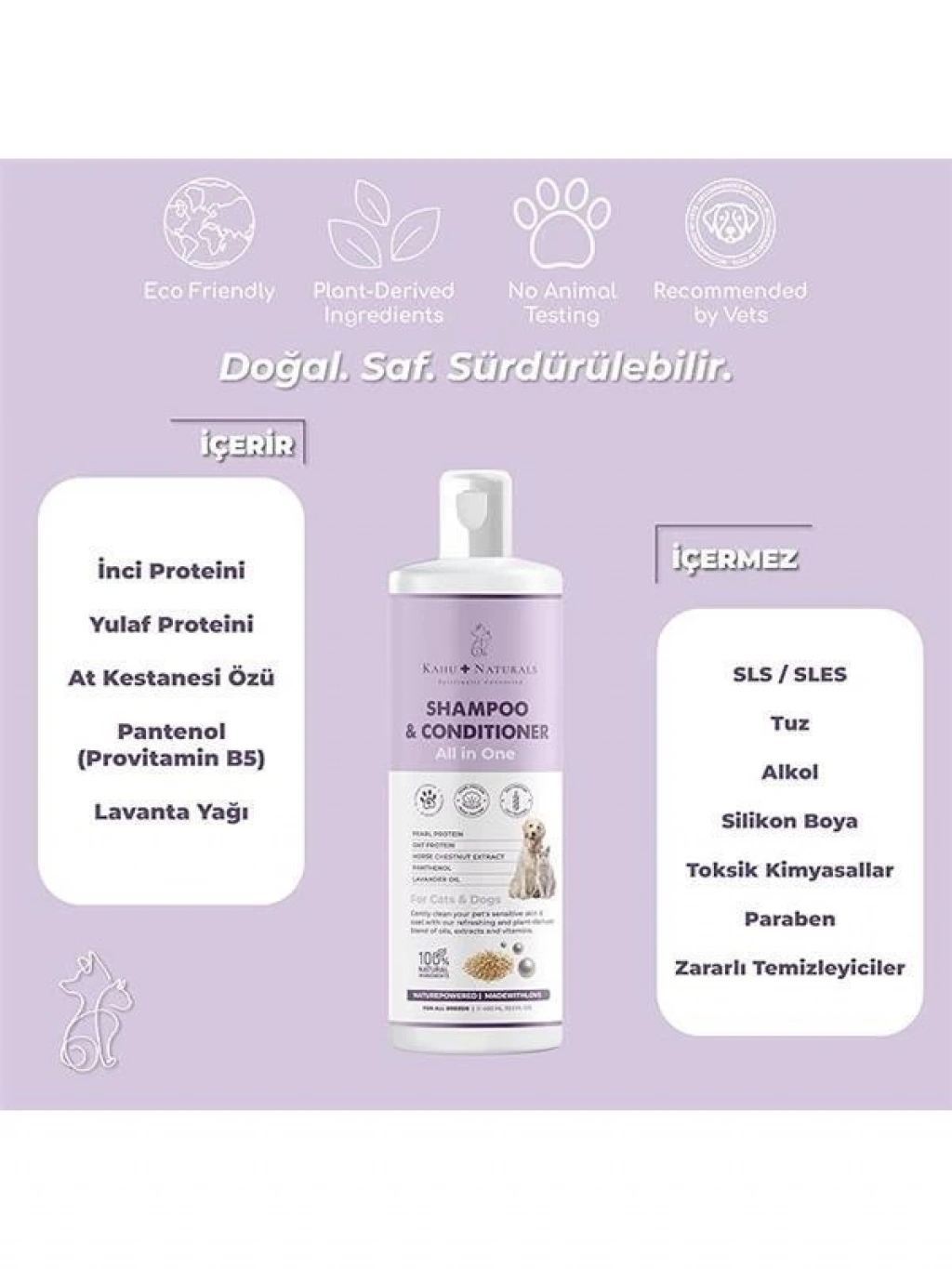 Bu ürün hakkında Naturals All in One Şampuanı kedi ve köpek dostlarımız için özel olarak özgün içerikler ile formüle edilmiştir Doğal içeriklerin gücünü kullanarak tüy ve cilt sağlığını en üst düzeye çıkarır İçeriğindeki İnci Proteini Yulaf Proteini At Kestanesi Tohum Ekstresi ve Pantenol ile tüylere ipeksi bir parlaklık kazandırırken cildi derinlemesine besler ve korur kürkün daha sağlıklı olmasına yardımcı olur Derinin onarımını teşvik eder hassas cildi rahatlatır Cilt bariyerini güçlendirerek cilt sağlığını destekler Düzenli kullanımda tüy dökülmelerini azaltır ve sağlıklı güçlü tüy yapısının oluşmasına yardımcı olur Cildi nemlendirip iyileştirirken kürkün elastikiyetini arttırır ve kırılma riskini azaltır Yıkama sonrasında formülündeki nemlendiriciler sayesinde tüylerin kolay taranmasını sağlar Kıtık oluşmasını ve topaklanmayı engeller Zararlı temizleyiciler SLS SLES Tuz Alkol Boya Silikon Paraben Yapay Parfüm içermez Çevre dostu temizleyiciler ve doğal içeriklerle formüle edilip Veteriner Hekimler ve Pet Bakım Uzmanlarının önerileri doğrultusunda geliştirilmiştir Hassas ciltler ve kedi ve köpeklerin dermatolojik pHı için uygundur Bakım özelliklerinin yanı sıra cildin onarımını teşvik edici ve yatıştırıcı özellikleriyle çok yönlü fayda sunar Kolay durulanan yapısı ve lavanta bahçesi esansiyel yağının hoş kokusuyla banyo zamanı patili dostlarımız için çok daha keyifli hale gelir