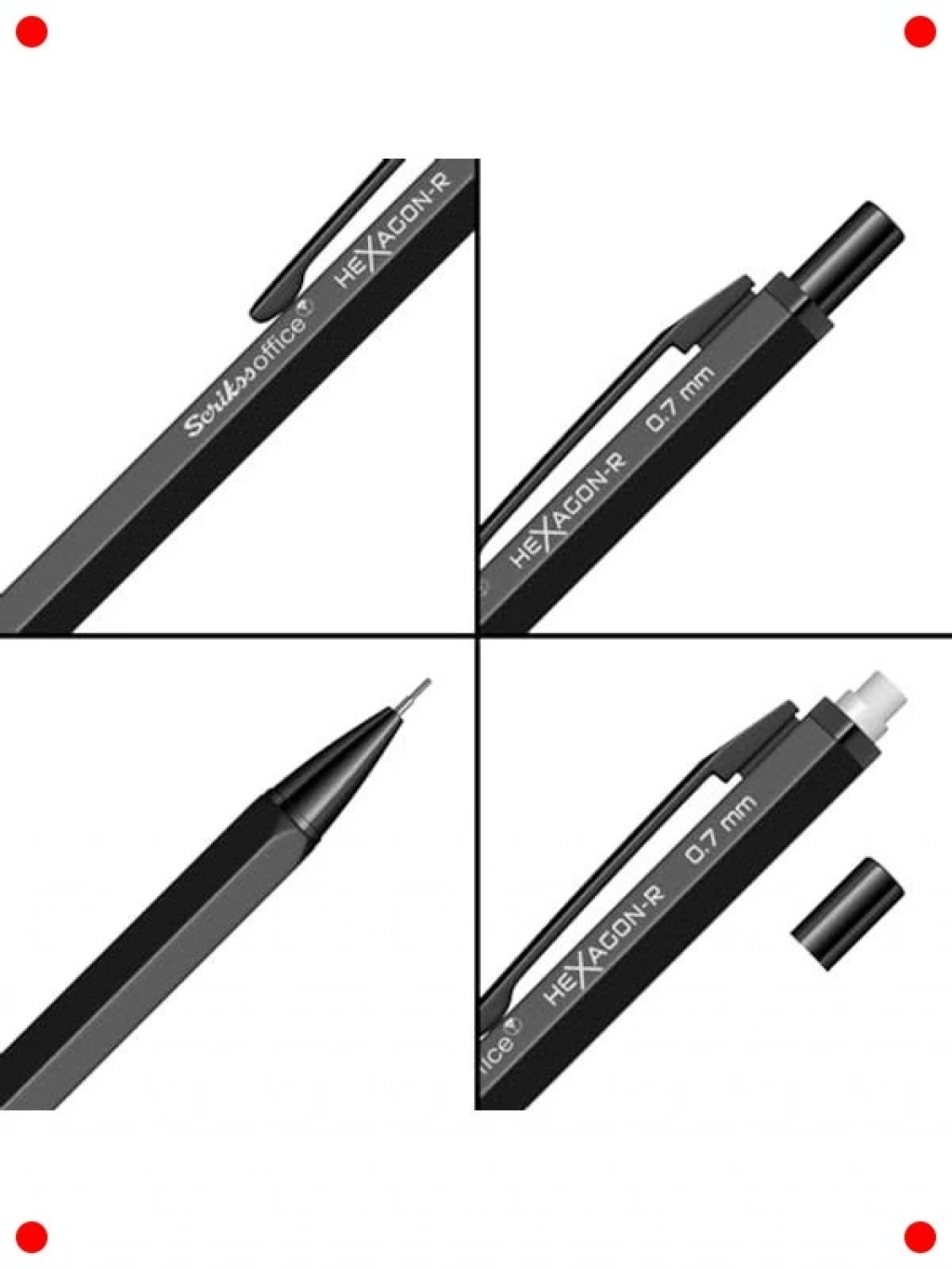 Benzersiz altıgen gövde tasarımıyla hem şık hem de ergonomik bir kullanım sunan bu siyah mekanik kurşun kalem, masanızda yuvarlanma sorununa son verir. 0.7mm ucu sayesinde hassas ve keskin çizgiler çekerek, notlarınızı, çizimlerinizi veya teknik çalışmalarınızı kusursuz hale getirir. Sağlam yapısı ve konforlu tutuşuyla uzun süreli yazım seanslarında bile el yorgunluğunu en aza indirir. Entegre silgisi ve dayanıklı metal klipsi, pratik kullanım imkanları sunar. Öğrencilerden mühendislere kadar geniş bir kullanıcı kitlesi için tasarlanmış, estetik ve işlevsel bir araçtır.
