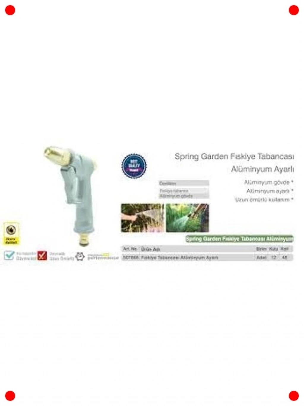 Bahçe sulama, araba yıkama ve genel temizlik işlerinizi kolaylaştırmak için tasarlanmış bu alüminyum ayarlı fıskiye sulama tabancası, dayanıklı yapısı ve çok yönlü kullanımıyla öne çıkıyor. Yüksek kaliteli alüminyum gövdesi sayesinde paslanmaya ve darbelere karşı dirençlidir, uzun ömürlü kullanım sunar. Ayarlanabilir başlığı sayesinde farklı püskürtme modları arasında geçiş yapabilir; ince sisle narin bitkileri sulayabilir, güçlü jet ile kirleri temizleyebilir veya konik püskürtme ile geniş alanları kapsayabilirsiniz. Ergonomik tutma yeri ve kilitlenebilir tetiği sayesinde uzun süreli kullanımlarda bile yorulmazsınız. Bahçe işlerinizde pratik ve güvenilir bir yardımcıdır.