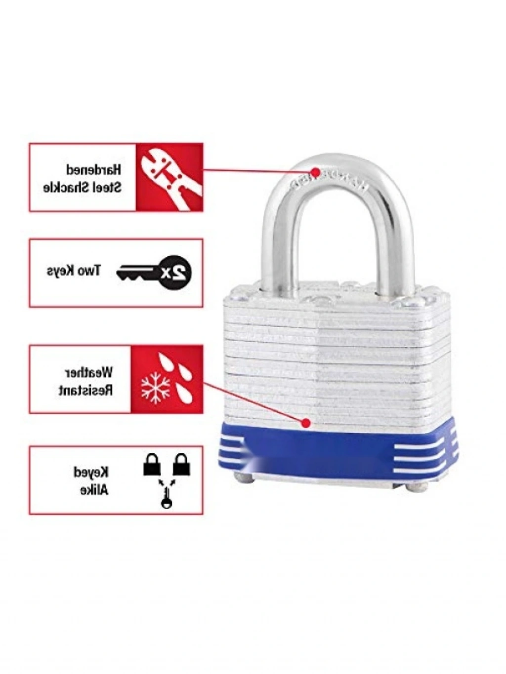 Bu anahtarlı dış mekan asma kilit seti, konut kapıları, çitler, depolar ve atölyeler gibi birçok alanda güvenlik sağlar. Kesilmeye karşı dayanıklı lamine çelik gövde ve sertleştirilmiş çelik kelepçe ile üretilmiştir. Her kilit, maksimum güvenlik için 4 pin silindiri ve çift bilyalı kilitleme sistemi barındırmaktadır. 51 mm genişliğindeki kilit gövdesi ile rahat bir kullanım sunar. İki anahtarlı set içeriğiyle, her iki kilidi de açmak için aynı anahtar kullanılabilir.