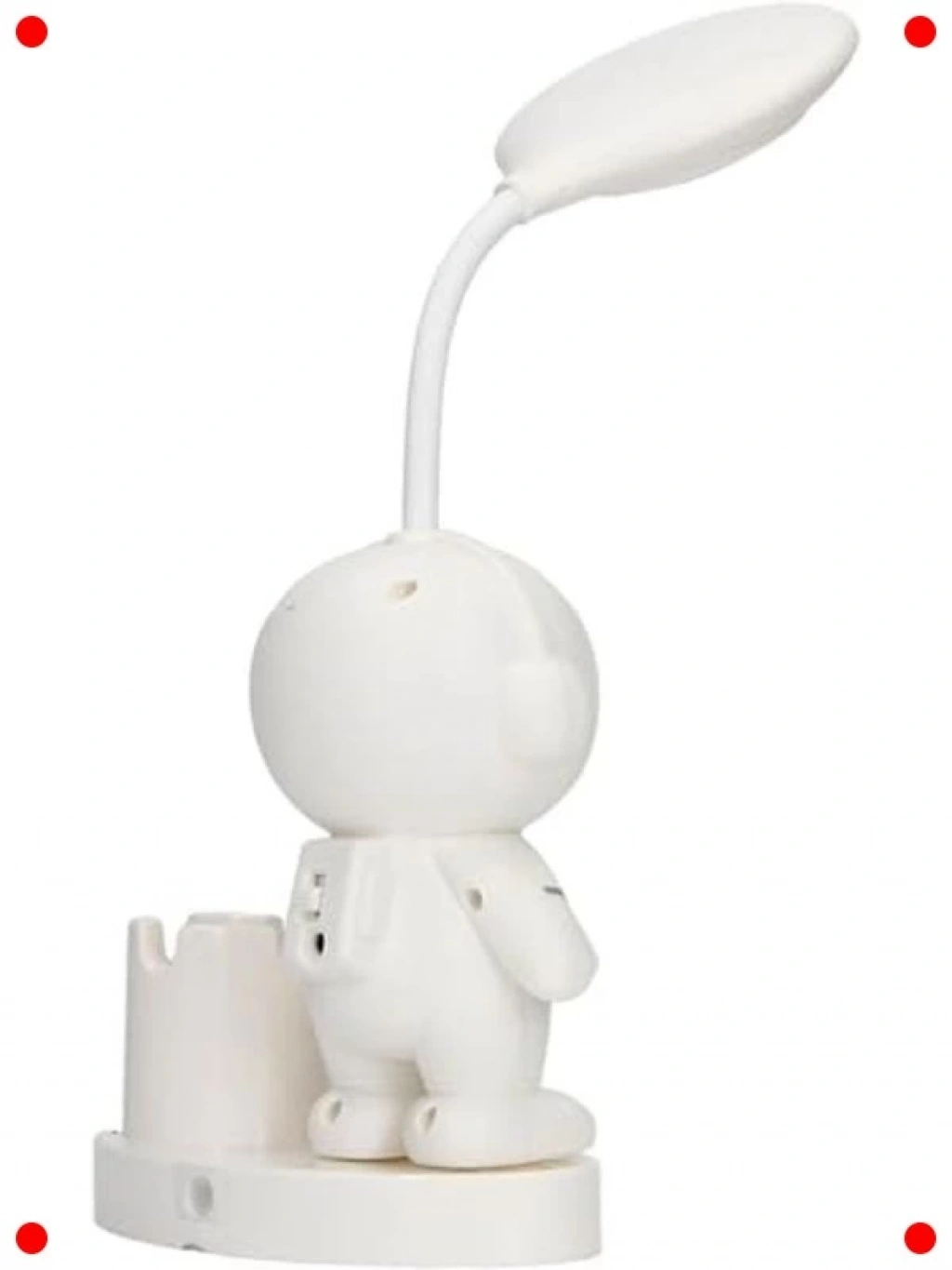 Çalışma masalarınıza hem fonksiyonellik hem de eğlence katacak bu sevimli astronot masa lambası, beyaz silikon tasarımıyla dikkat çekiyor. Çocuk odaları, öğrenci masaları veya yaratıcı çalışma alanları için mükemmel bir seçimdir. Şarj edilebilir özelliği sayesinde kablo karmaşasından kurtulur, dilediğiniz her yere kolayca taşıyabilirsiniz. Yumuşak silikon malzemesi dayanıklı ve güvenlidir. Lambanın entegre kalem tutucusu, kırtasiye malzemelerinizi düzenli tutmanıza yardımcı olarak çalışma alanınızı daha verimli hale getirir. Göz yormayan ışığıyla uzun süreli çalışmalarda konfor sağlarken, ayarlanabilir aydınlatma seviyeleri ihtiyacınıza göre esneklik sunar. Hem dekoratif hem de pratik bir aydınlatma çözümü arayanlar için ideal.