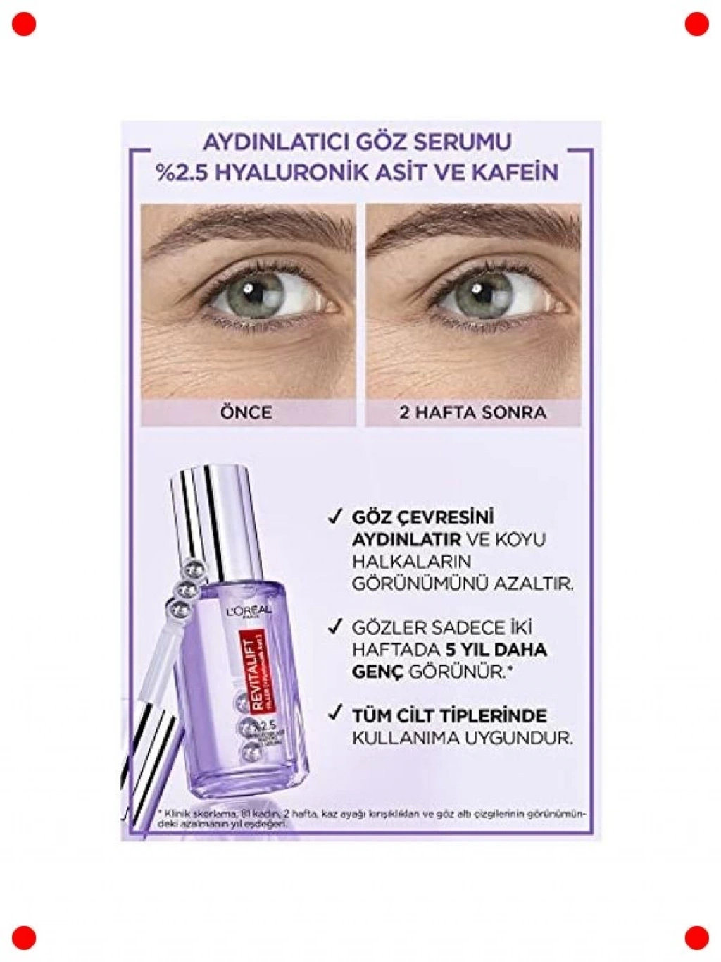 Göz çevresindeki yorgunluk belirtilerini ve ince çizgileri hedef alan bu aydınlatıcı serum, gözlerinizin daha genç ve dinlenmiş görünmesini sağlar. Özel formülü, koyu halkaların görünümünü azaltmaya ve göz çevresindeki cildi nemlendirmeye yardımcı olur. Hafif dokusu sayesinde cilt tarafından hızla emilir ve yapışkan bir his bırakmaz. Düzenli kullanımla göz çevresindeki hassas cildin elastikiyetini artırır ve daha pürüzsüz bir görünüm kazandırır. 20 ml'lik pratik ambalajıyla kolayca uygulanır ve günlük cilt bakım rutininizin önemli bir parçası haline gelir. Gözlerinize ışıltılı bir parlaklık katın.