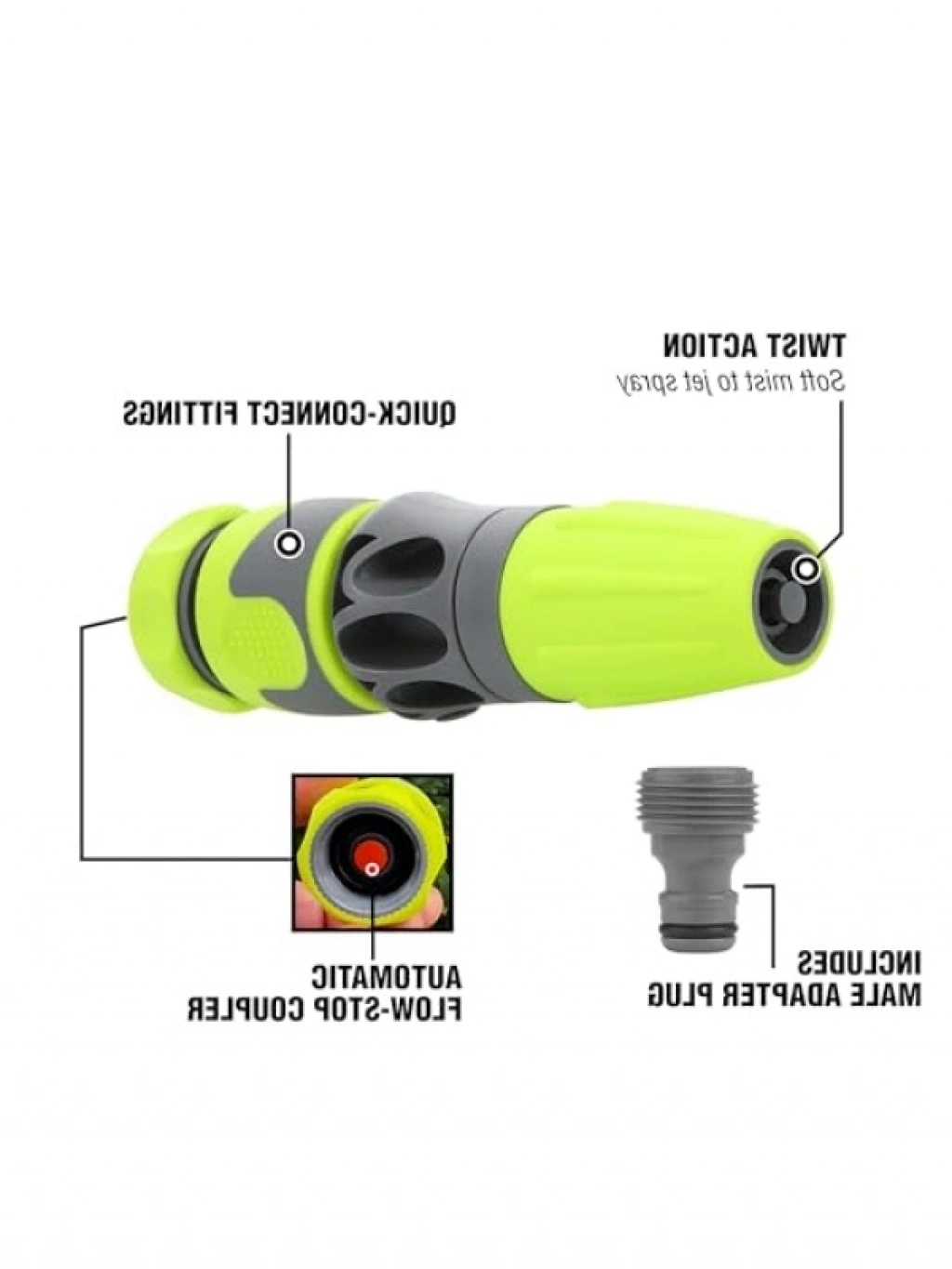 Bahçe işlerinizi daha pratik hale getirecek bu set, hızlı bağlantı püskürtme başlığı ve akış durdurucu kuplör ile birlikte gelir. Uzun mesafelerde etkili jet püskürtme ve çiçekler için yumuşak sis püskürtme imkanı sunar. Akış durdurma kuplörü, su sıçramasını önleyerek işlerinizi kolaylaştırır. Fıstık yeşili rengi ile bahçenize estetik bir görünüm katar.