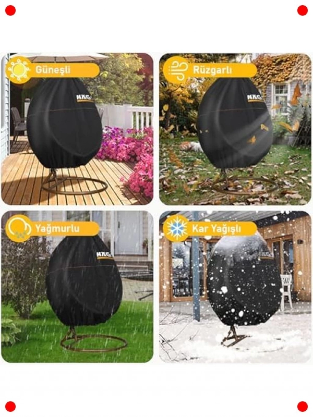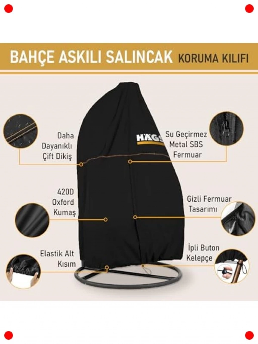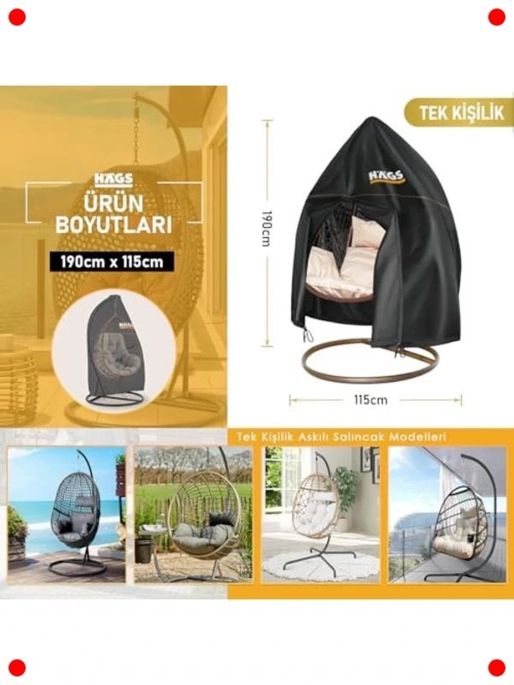 Dış mekan mobilyalarınızı dört mevsim boyunca korumak için tasarlanmış bu su geçirmez bahçe salıncağı örtüsü, salıncak koltuğunuzun veya hamak sandalyenizin ömrünü uzatır. 190 x 115 cm boyutlarıyla çoğu standart salıncağa uyum sağlar. Dayanıklı ve hava koşullarına dayanıklı malzemeden üretilmiştir, bu sayede yağmur, kar, güneşin zararlı UV ışınları ve toz gibi dış etkenlere karşı üstün koruma sağlar. Mobilyalarınızın rengini ve dokusunu korurken, temizliğini de kolaylaştırır. Kolayca takılıp çıkarılabilir, pratik bir kullanım sunar ve mobilyalarınızın her zaman yeni gibi kalmasına yardımcı olur.