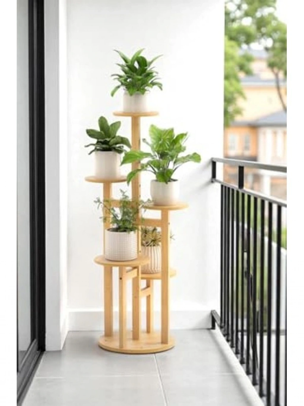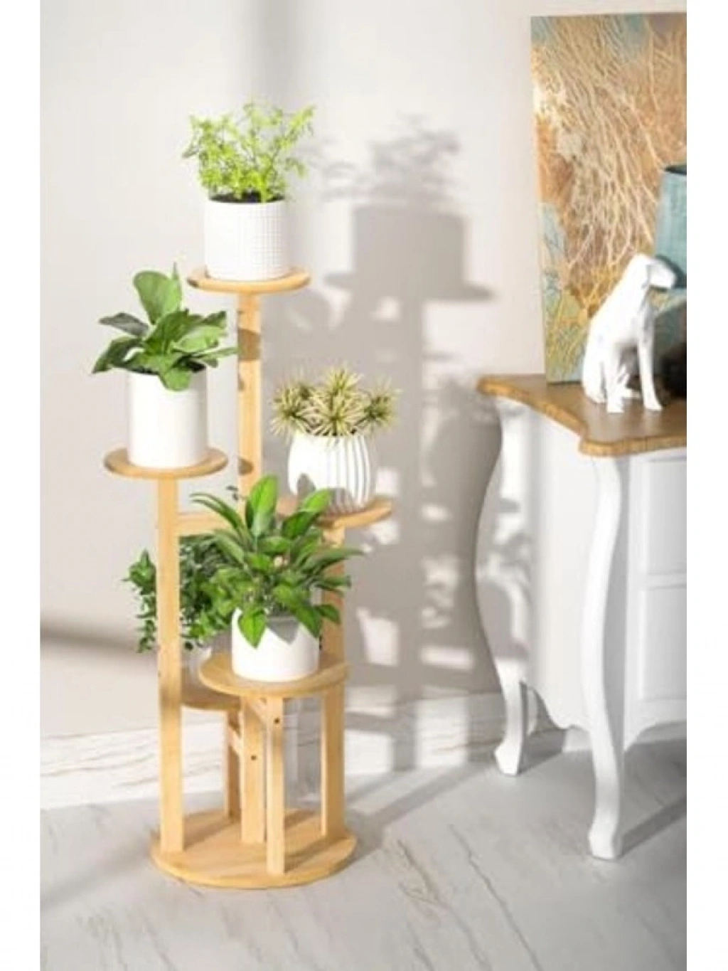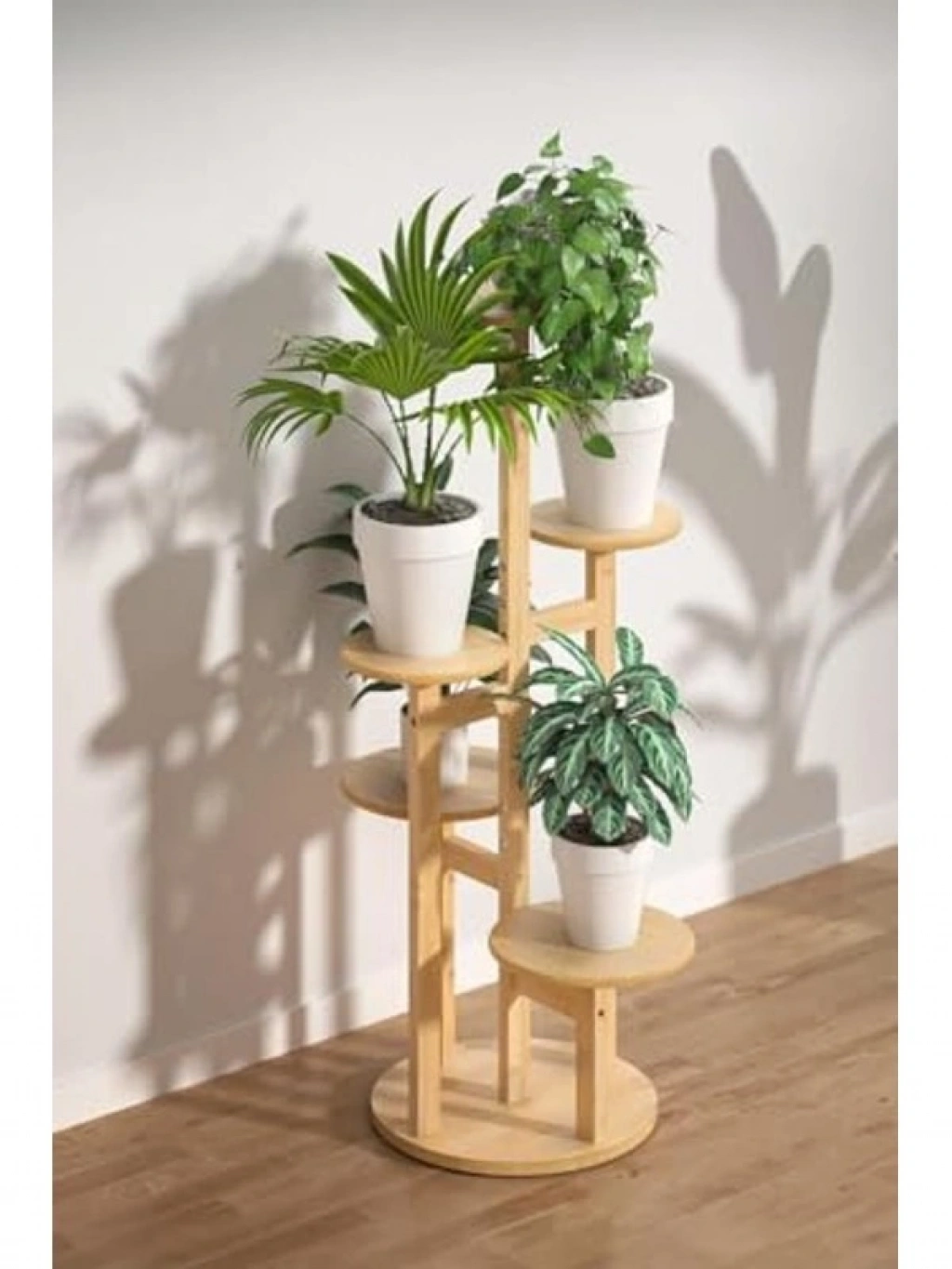 Bambu yuvarlak formdaki 5 raflı saksılık, pratik bir organizer işlevi görür. Bitkilerinizi düzenli bir şekilde sergilemek için ideal bir seçenektir.