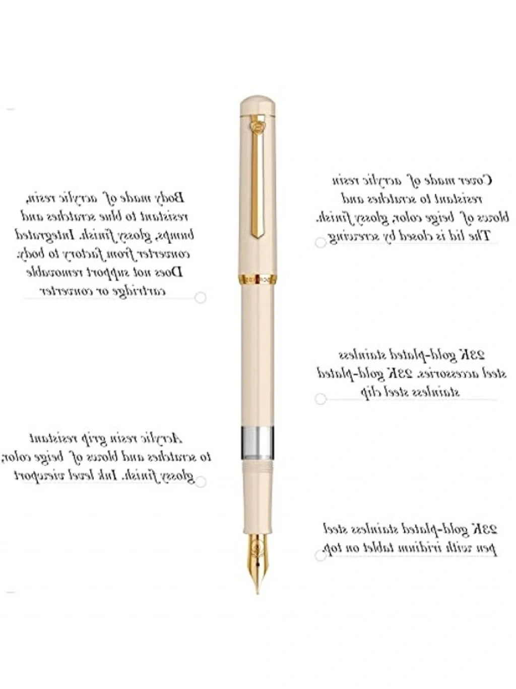 Şık bir tasarıma sahip bej renkli dolmakalem, altın kaplama klips ve halkalarla zenginleştirilmiştir. Kendinden pistonlu mekanizması ile mürekkep akışı sağlarken, özel kutusu ile de şıklığını artırır.