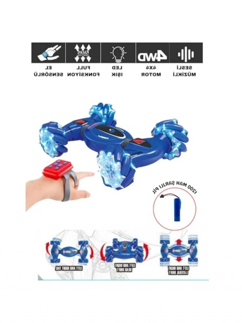 Bilekten kontrol ile 360° hareket kabiliyeti sunan bu akrobat drift arabası, tam fonksiyonel ileri-geri, sağ-sol hareketleri ile hız tutkunlarına hitap eder. 1200 mAh şarjlı pil ve 4x4 motoru ile etkileyici drift becerileri sergiler. LED ışıkları ve sesli müzik özellikleri ile oyun keyfini artırır.