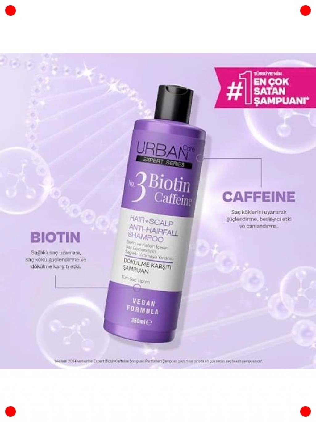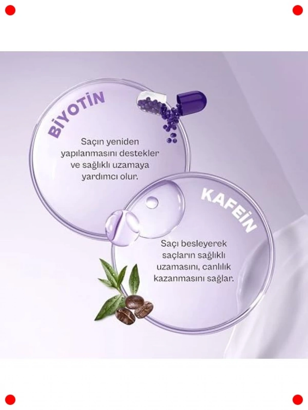 Saç dökülmesine eğilimli ve zayıf saçlar için özel olarak geliştirilen bu şampuan, Biotin ve Kafein'in güçlendirici etkilerini bir araya getirir. Biotin, saç tellerini besleyerek kırılmayı azaltmaya ve saçın doğal uzamasını desteklemeye yardımcı olur. Kafein ise saç köklerini uyararak daha canlı ve güçlü saçların oluşumunu teşvik eder. Saç derisini canlandırır ve saçların daha dolgun görünmesini sağlar. 350 ml'lik pratik boyutuyla günlük kullanıma uygundur.