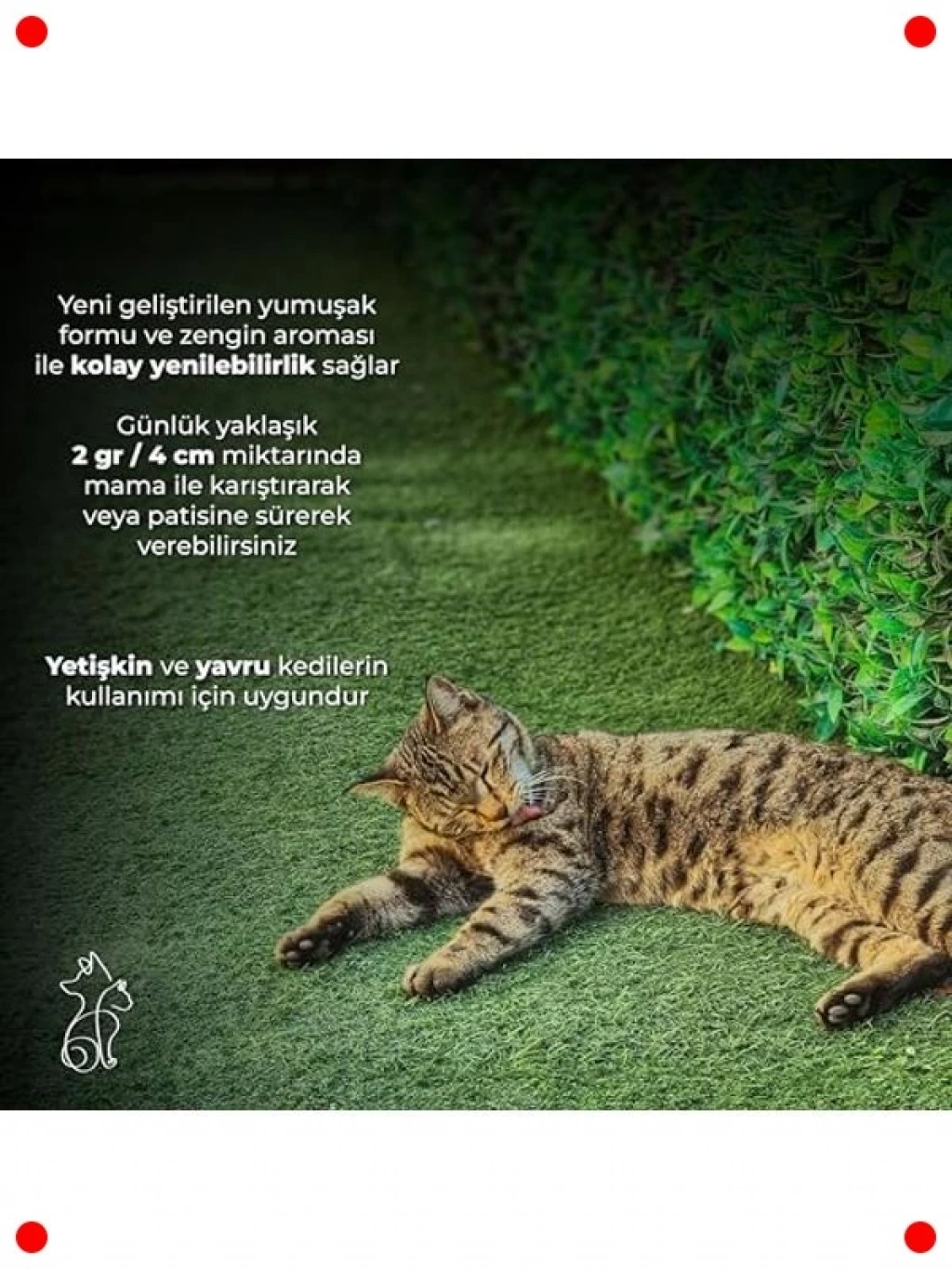 Kedinizin stresli durumlarla başa çıkmasına yardımcı olmak için özel olarak formüle edilmiş bu bitkisel sakinleştirici malt macun, 100 ml'lik pratik tüpüyle sunulur. Seyahat, veteriner ziyaretleri, yeni bir ortama adaptasyon veya gürültü gibi stres faktörlerinde kedinizin rahatlamasına ve sakinleşmesine destek olur. İçeriğindeki doğal bitkisel özler, kedinizin huzurlu hissetmesini sağlarken, herhangi bir uyuşukluk veya yan etkiye neden olmaz. Lezzetli tadı sayesinde kediniz tarafından kolayca kabul edilir. Kedinizin yaşam kalitesini artırarak daha huzurlu ve mutlu bir yaşam sürmesine yardımcı olur.