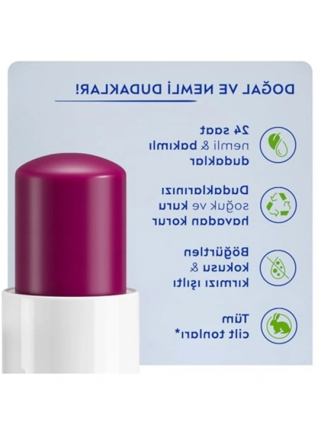 Narin dudaklar için özel olarak formüle edilmiş böğürtlen kokulu dudak bakım kremi, 24 saat boyunca nemlendirme ve pürüzsüzleştirme sağlar. Işıltılı renk ve doğal görünüm kazandıran bu ürün, ciltle uyumu dermatolojik olarak test edilmiştir. Mineral yağı içermez, böylece güvenli bir kullanım sunar.