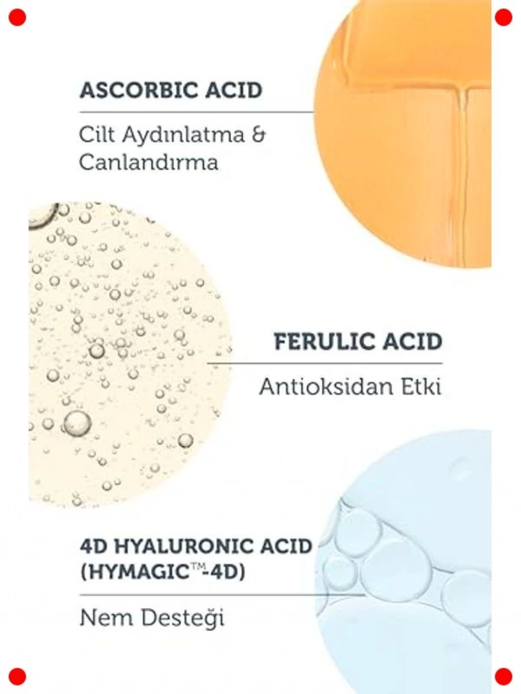 Cildinizi aydınlatmak ve tonunu eşitlemek için özel olarak formüle edilmiş bu C vitamini serumu ile daha canlı bir görünüme kavuşun. Güçlü antioksidan özelliği sayesinde cildinizi çevresel faktörlere karşı korurken, koyu lekelerin ve renk farklılıklarının görünümünü azaltmaya yardımcı olur. Kolajen üretimini destekleyerek cildin elastikiyetini artırır ve daha genç bir görünüm kazandırır. Hafif yapısı sayesinde cilde hızla nüfuz eder, yağlı bir his bırakmaz. Seyahat boyu 8 ml'lik pratik ambalajı ile her yere kolayca taşıyabilir, cilt bakım rutininizi aksatmadan devam ettirebilirsiniz.