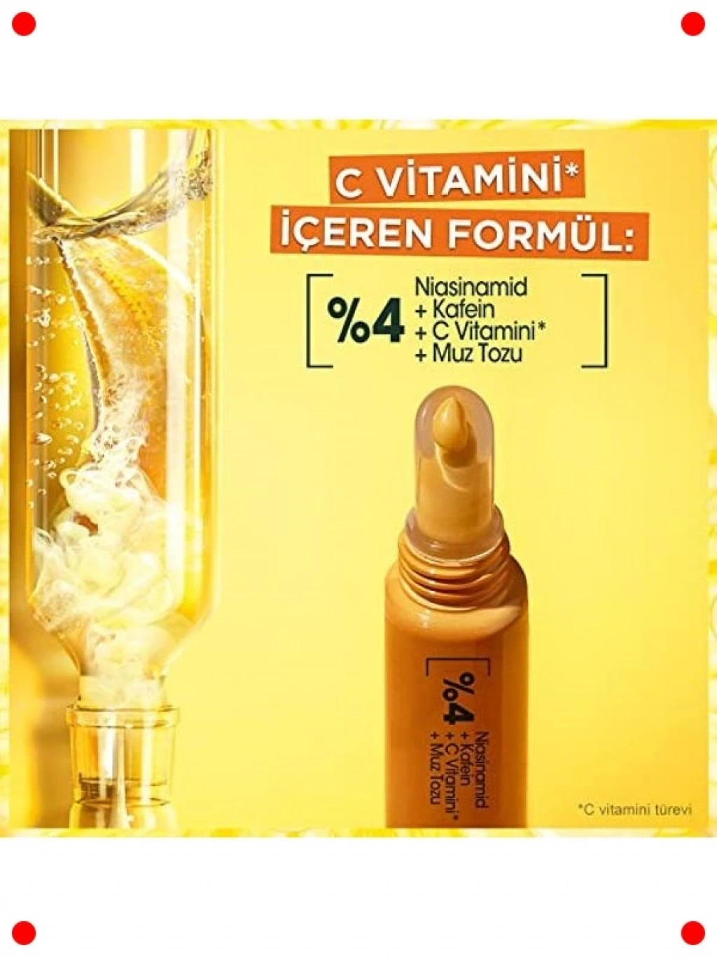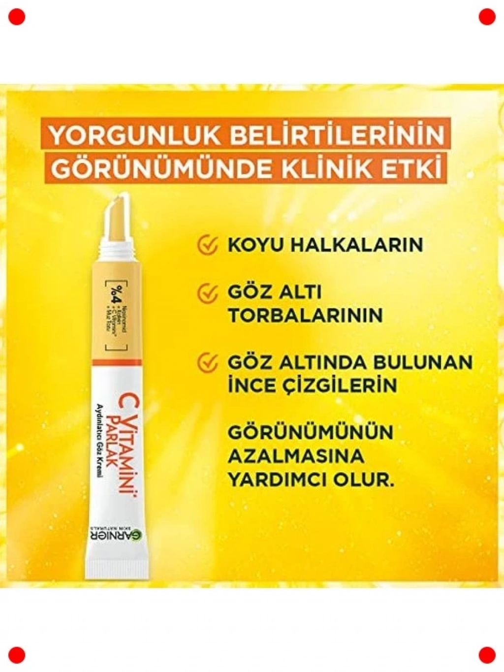 Göz çevrenizdeki koyu halkaları ve yorgunluk izlerini azaltmak için C vitamini ile zenginleştirilmiş bu aydınlatıcı göz kremini keşfedin. Özel formülü, hassas göz çevresi cildini nemlendirirken aynı zamanda daha aydınlık ve genç bir görünüm kazandırmaya yardımcı olur. C vitamini sayesinde antioksidan koruma sağlar ve cildin doğal parlaklığını destekler. Düzenli kullanımda göz çevrenizdeki ince çizgilerin ve kırışıklıkların görünümünü azaltmaya katkıda bulunur. Hafif dokusu sayesinde ciltte kolayca emilir ve makyaj altına rahatlıkla uygulanabilir. Gözlerinizin daha canlı ve dinlenmiş görünmesini sağlar.