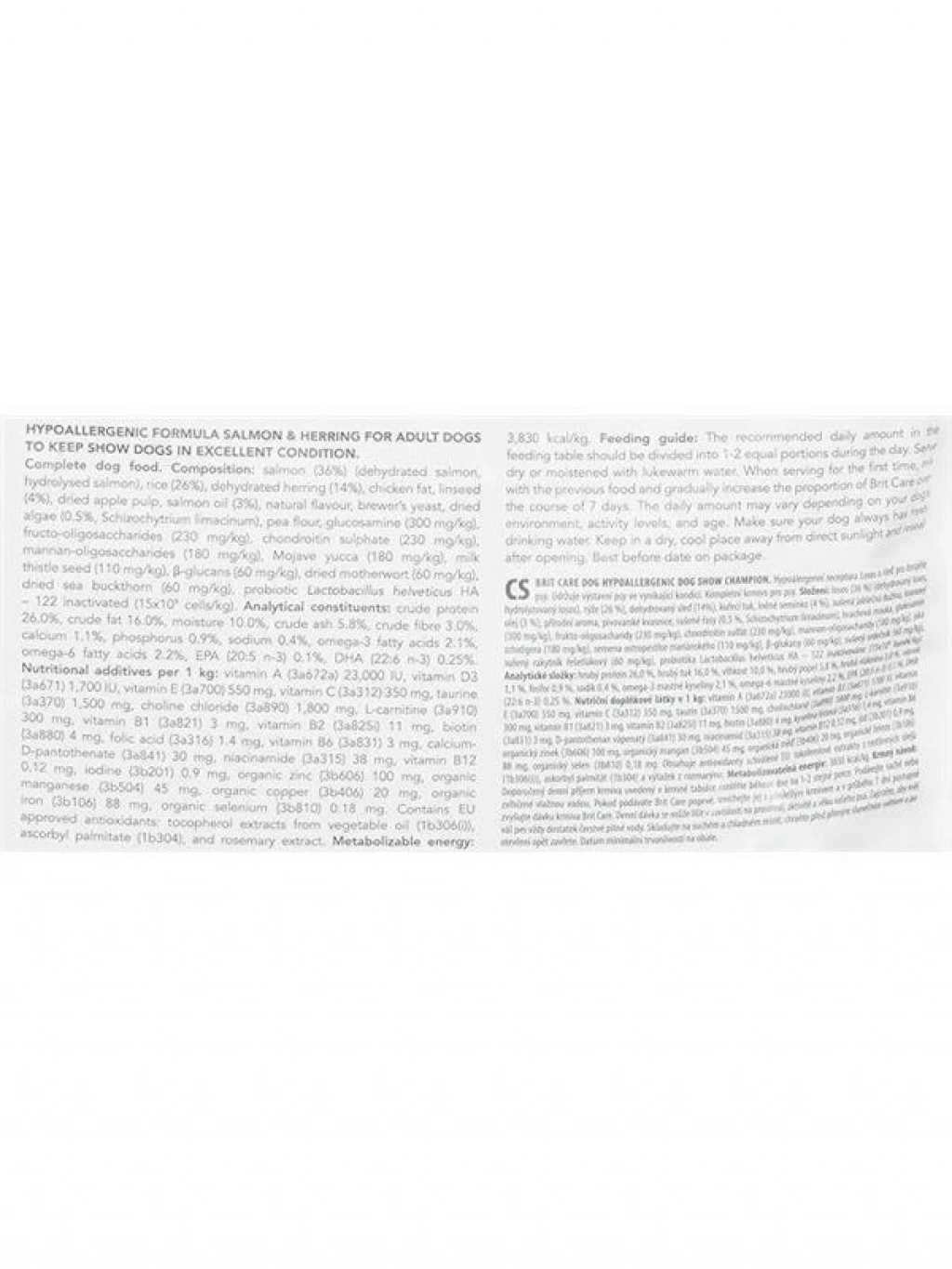 Bu ürün hakkında Yarışma köpeklerinin mükemmel kondisyonunu muhafaza etmek için geliştirilmiş Somon ve Ringa Balıklı tam ve dengeli mama 36 somon (kurutulmuş somon hidrolize somon) 26 pirinç 14 kurutulmuş hamsi tavuk yağı 4 keten tohumu kurutulmuş elma posası 3 somon yağı doğal aroma bira mayası 05 kuru yosun (Schizochytrium limacinum) bezelye unu 300 glukozamin 230 fruktooligosakkarit 230 kondroitin sülfat 180 mannanoligosakkarit 180 Mojave yucca 110 süt dikeni tohumu 60 glukan 60 kurutulmuş anason 60 kurutulmuş denizdutu probiyotik Lactobacillus helveticus HA 122 inaktif (15x109 hücrekg)