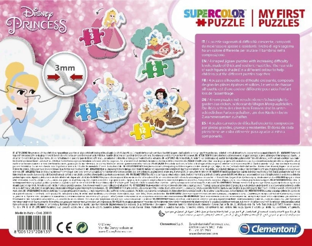 Clementoni My First Puzzles serisi, 3-6-9-12 parçalı, kalın ve dayanıklı yapbozlardan oluşan artan zorlukta dört şekilli bulmaca sunar. Çocukların el becerilerini, mantık yürütme yeteneklerini ve gözlem becerilerini geliştirmek için tasarlanmış bu bulmacalar, parlak ve ışıltılı renkleriyle dikkat çeker. Çocukların sevdiği karakterlerin yer aldığı görüntülerle dolu olan bu set, oyun saatlerini daha eğlenceli hale getirir.