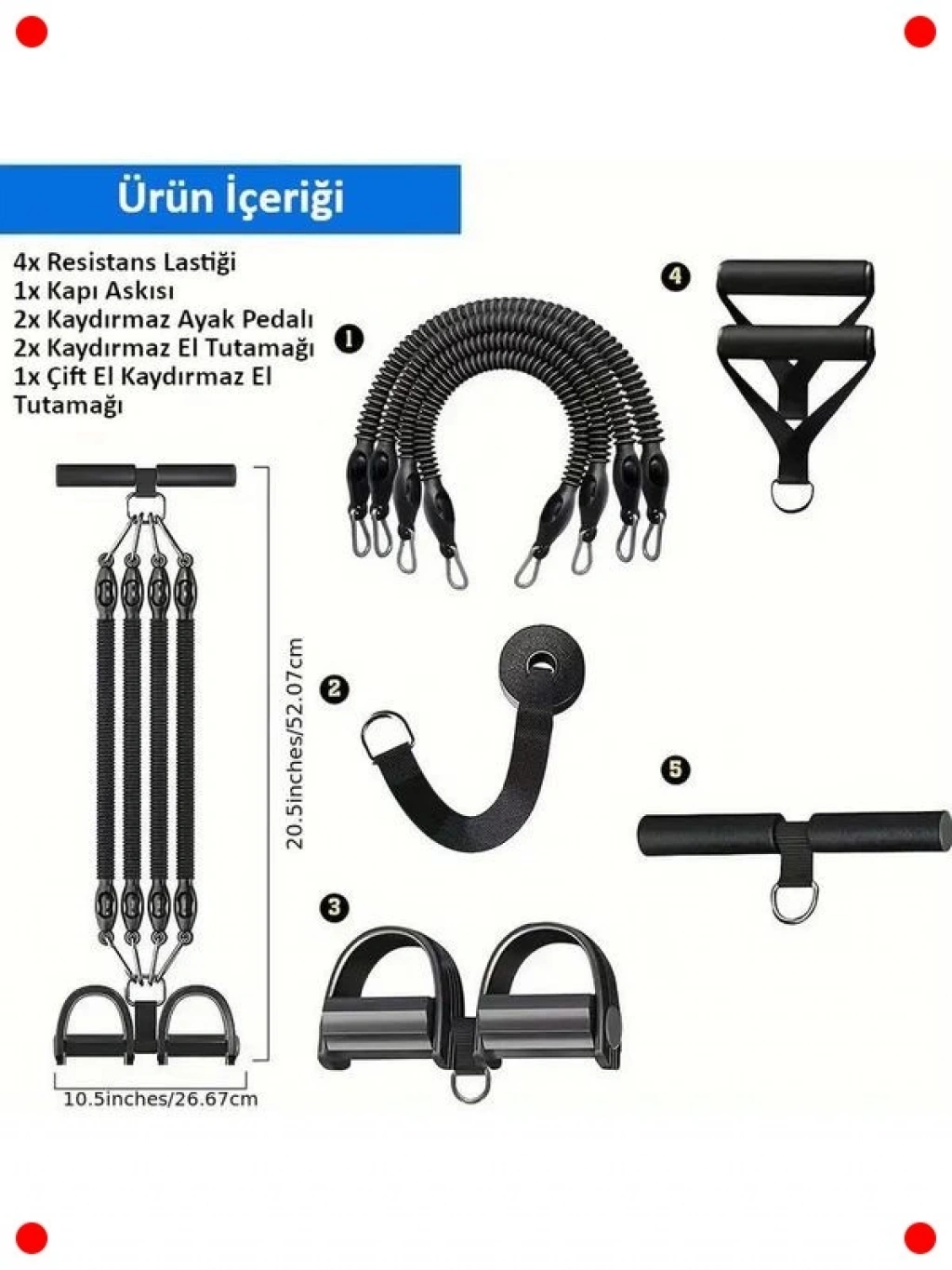 Bu çok fonksiyonlu 10 parçalık egzersiz seti ile tüm vücudunuzu evinizin konforunda çalıştırın. El, ayak, göğüs ve kapı yayı gibi çeşitli aparatları sayesinde farklı kas gruplarını hedefleyebilir, kuvvetinizi ve dayanıklılığınızı artırabilirsiniz. Farklı direnç seviyeleri sunarak hem başlangıç seviyesindekilere hem de ileri düzey sporculara hitap eder. Kompakt yapısı sayesinde kolayca saklanabilir ve her yere taşınabilir. Evde, ofiste veya seyahat ederken antrenmanlarınızı aksatmadan sürdürmeniz için idealdir. Bu set, kas geliştirme, tonlama, esneklik artırma ve genel fitness seviyenizi yükseltme konularında size kapsamlı bir çözüm sunar.