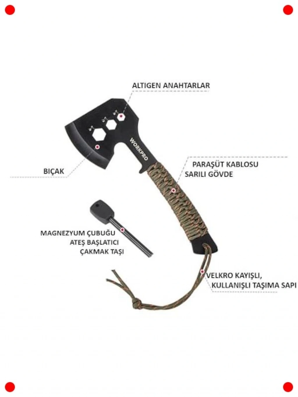 Kamp maceralarınızda ve açık hava etkinliklerinizde size eşlik edecek, çok yönlü ve dayanıklı bir araç. 250 mm'lik ideal boyutuyla taşıması kolaydır. Keskin baltası, odun kırmak, dalları budamak veya kamp alanı hazırlamak için mükemmeldir. Entegre magnezyum ateşleyici, herhangi bir koşulda kolayca ateş yakmanızı sağlar, böylece çakmak veya kibrit arama derdiniz olmaz. Sağlam ve ergonomik sapı, güvenli ve konforlu bir tutuş sunar. Hayatta kalma durumlarından basit kamp görevlerine kadar her an yanınızda bulundurmak isteyeceğiniz vazgeçilmez bir ekipman.
