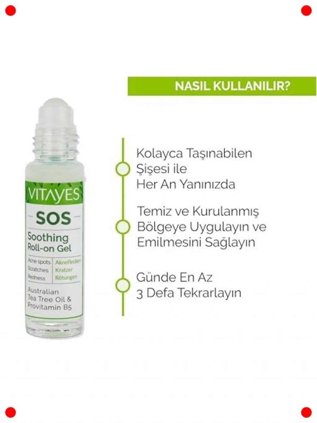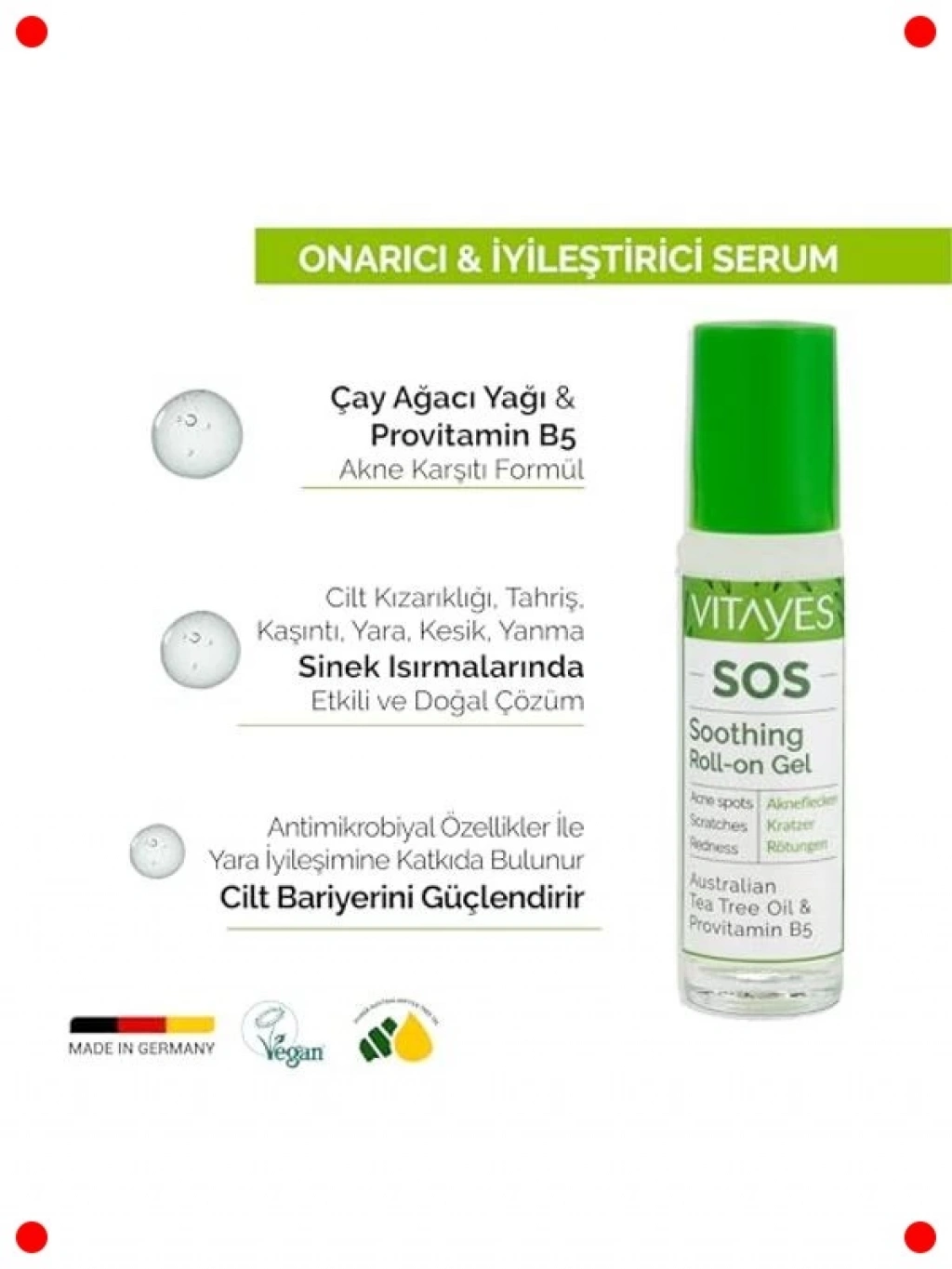 Çay Ağacı Yağı ve Provitamin B5 ile zenginleştirilmiş bu çok yönlü cilt serumu, akne, sivilce, siyah nokta ve cilt kızarıklığı gibi sorunları hedef alır. Aynı zamanda kaşıntı ve sinek böcek ısırıklarına karşı onarıcı etki sunarak cildinizi yatıştırır. Cilt bariyerini güçlendirirken, cildin doğal dengesini destekler ve daha pürüzsüz bir görünüm kazandırır. Üçlü ambalajıyla uzun süreli ve kesintisiz bakım imkanı sunar. Sağlıklı, sakinleşmiş ve yenilenmiş bir cilt için kapsamlı bir çözümdür.