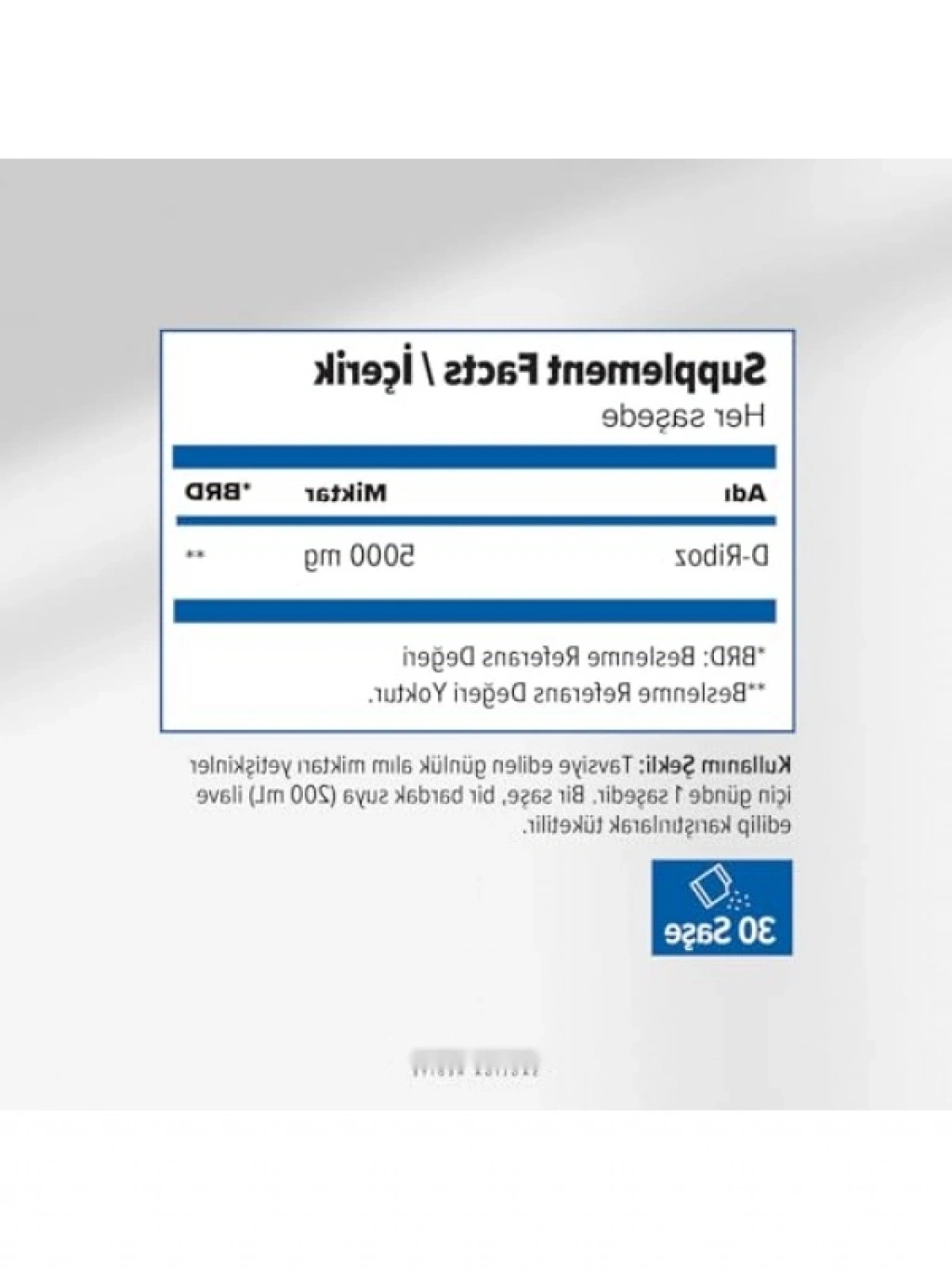 Enerji üretimini destekleyen D-Riboz, her bir saşede 5000 mg içeren gıda takviyesidir. Kullanım kolaylığı sağlayan saşe formu sayesinde, her zaman yanınızda taşıyabilirsiniz. Tavsiye edilen günlük alım miktarı yetişkinler için günde 1 saşe olup, bir bardak suya karıştırarak tüketilmesi önerilmektedir. Doğal enerji kaynağı olarak, sporcular ve yoğun tempoda çalışan bireyler için idealdir. Unutmayın, bu ürün ilaç değildir, sağlıklı yaşam destekleyicisi olarak kullanılmalıdır.