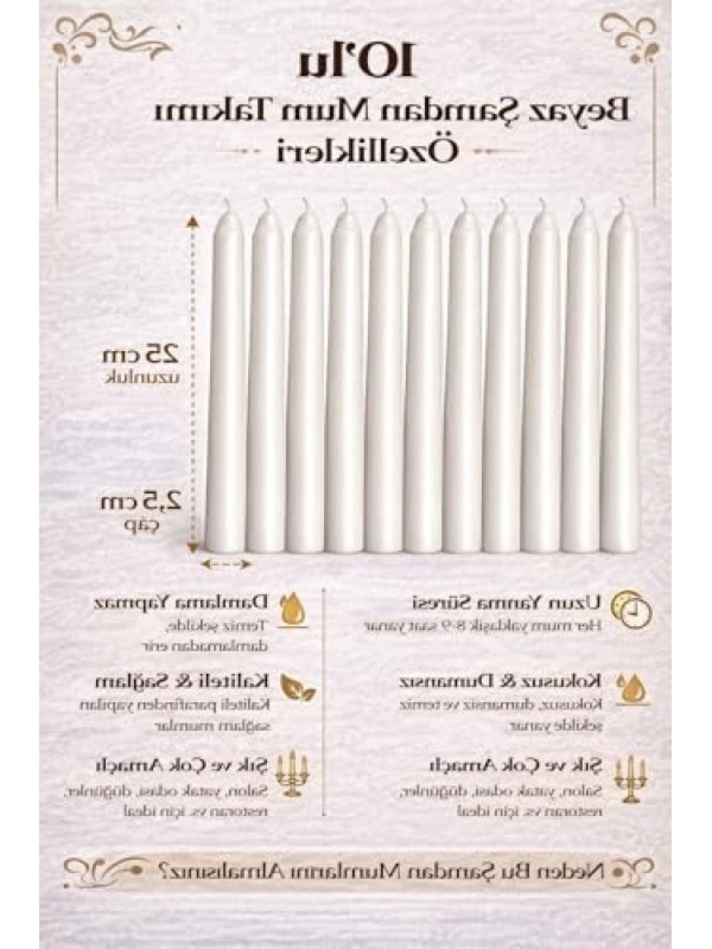 Şık masa ve özel gün dekorasyonları için ideal olan bu 10'lu beyaz şamdan mum seti, her biri 25 cm uzunluğundadır. Uzun yanma süresi sunan mumlar, 8-9 saat boyunca aydınlatma sağlar. Kokusuz ve dumansız yapıdadır, bu nedenle kapalı alanlarda rahatlıkla kullanılabilir. Damlama yapmayan yapısı ile temiz bir kullanım sunar. Davet sofraları ve organizasyonlar için mükemmel bir tercihtir.