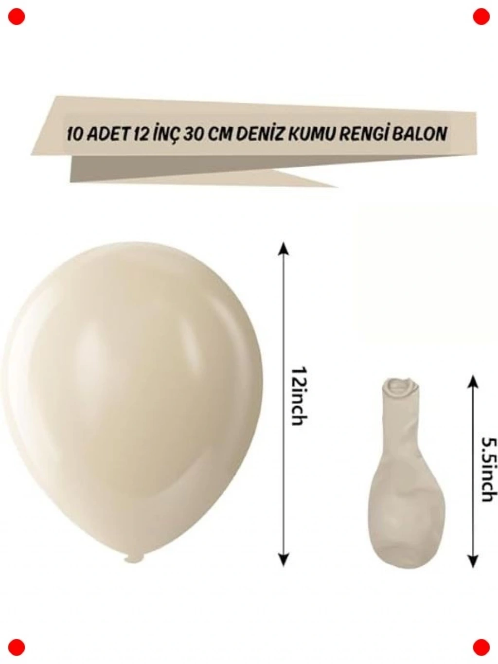 Özel günleriniz için tasarlanmış bu zarif deniz kumu rengi balon seti ile partilerinize sofistike bir dokunuş katın. Her biri 30 cm boyutundaki 10 adet kaliteli balondan oluşan bu set, doğum günleri, baby shower partileri, nişan törenleri veya diğer kutlamalar için mükemmel bir atmosfer yaratır. Kolayca şişirilip asılabilen bu balonlar, iç mekan ve dış mekan süslemelerinde estetik bir görünüm sağlar. Etkinliğinizin ambiyansını yükseltmek ve misafirlerinizi etkilemek için ideal bir seçimdir. Kaliteli malzemesi sayesinde uzun süre formunu korur ve partinizin unutulmaz anılarla dolu olmasına yardımcı olur. Şık ve çağdaş bir parti dekorasyonu arayanlar için vazgeçilmez bir üründür.