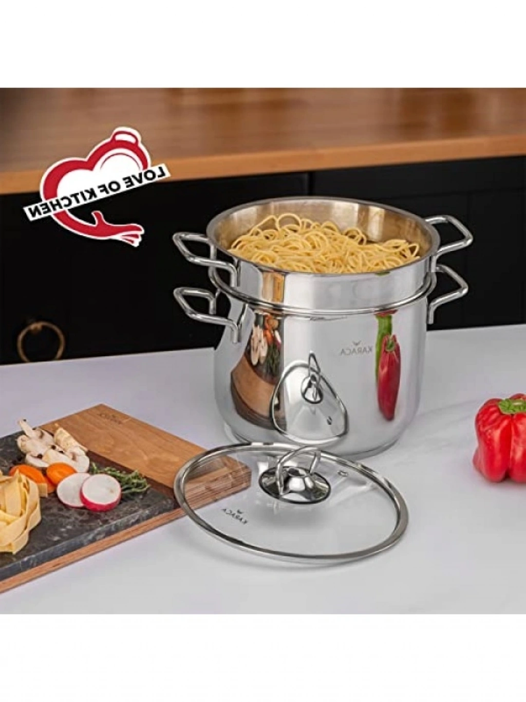 Bu çelik spagetti tenceresi, derin haşlama süzgeci ile birlikte gelmektedir ve tüm ocak tiplerine uygun olarak tasarlanmıştır. Paslanmaz çelik malzemeden üretilmiş olup, uzun ömürlü ve dayanıklıdır. Tüm makarna türlerini pişirmek ve süzmek için mükemmel bir seçimdir. Mutfaktaki tüm pişirme ihtiyaçlarınıza cevap verecek, şık bir tasarıma sahiptir.