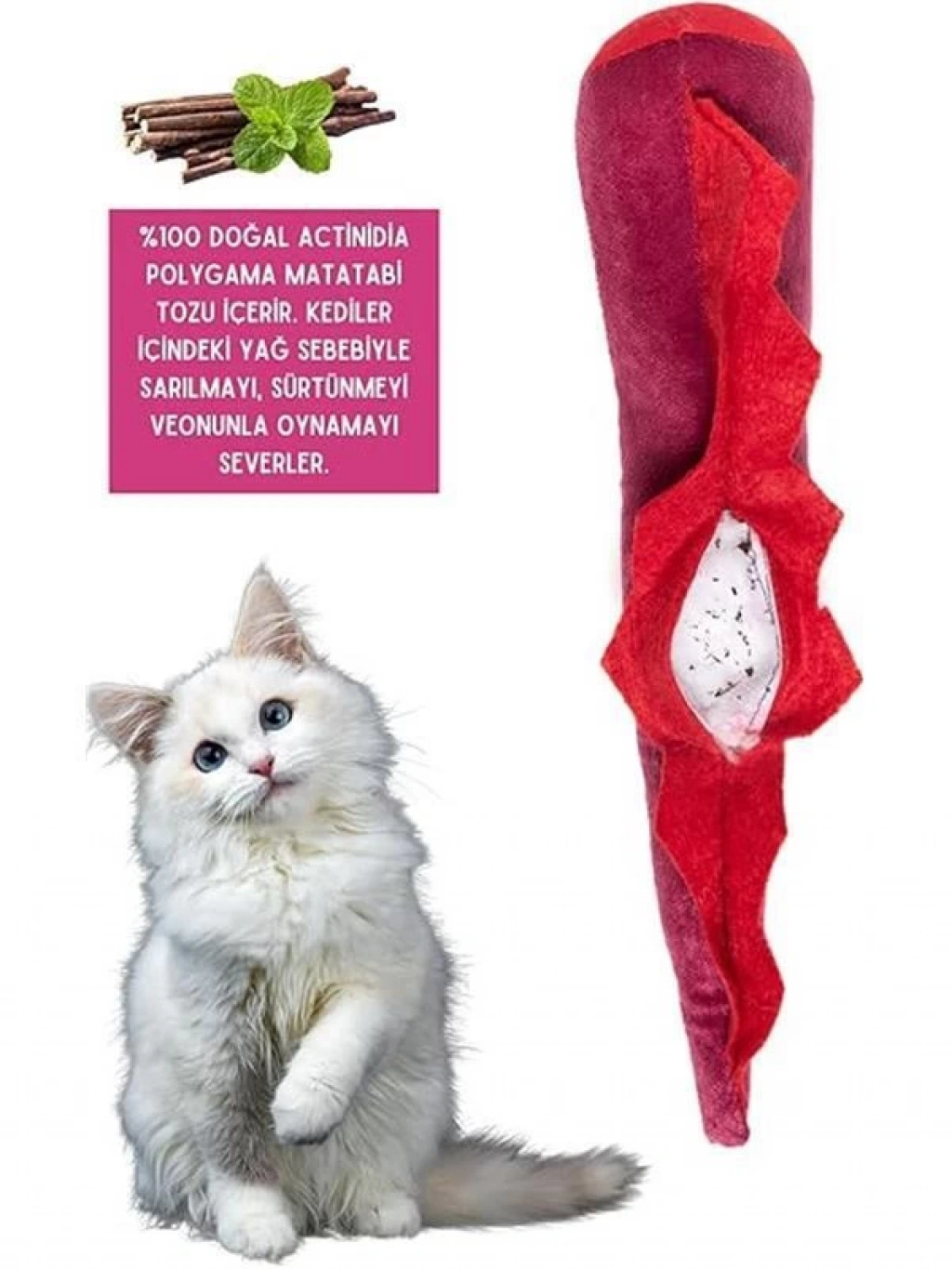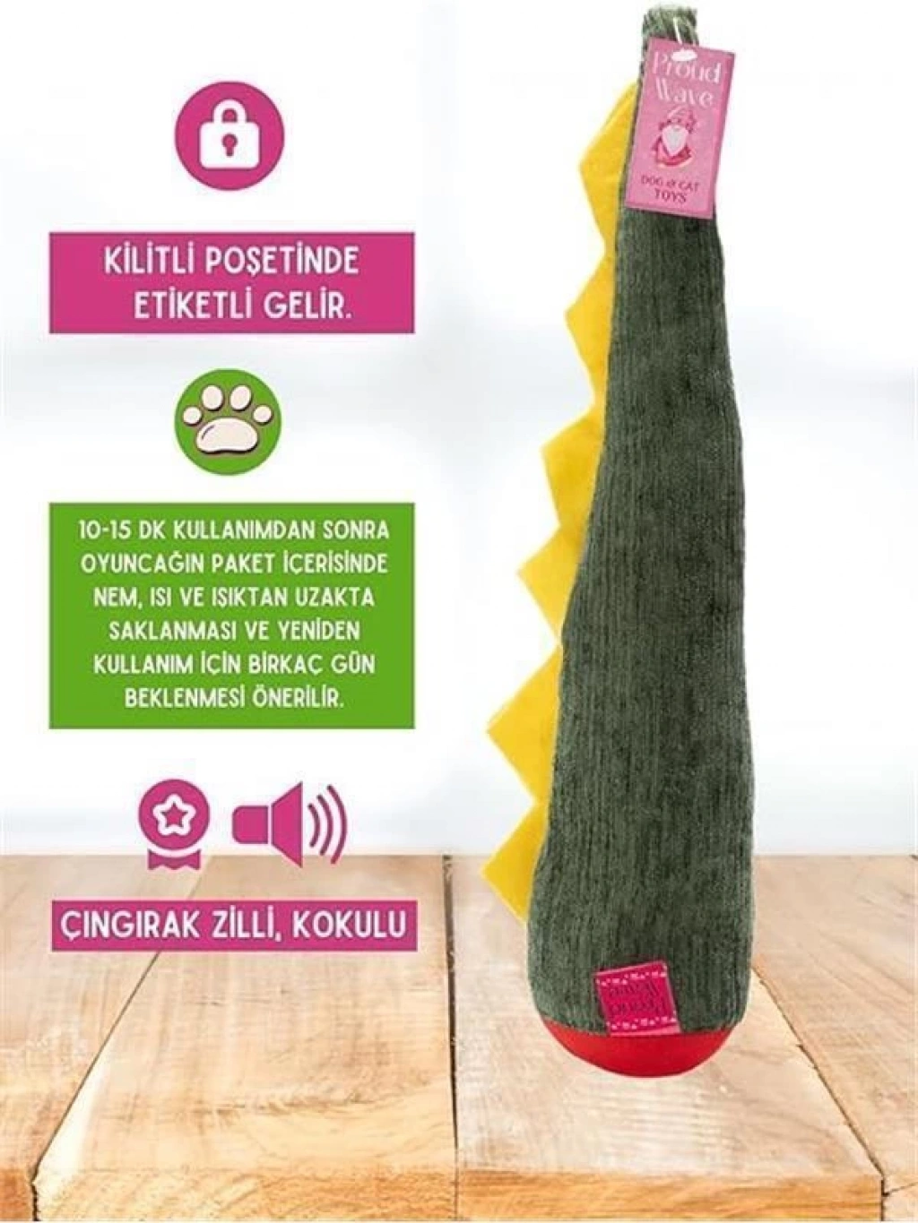 Bu ürün hakkında İçerisinde 100 doğal Actinidia polygama namı diğer matatabi ağacının en özel dallarından hazırlanmış matatabi tozu var Matatabi kedilerin temas etmekten hoşlandığı esansiyel yağları içerdiği için kediler ona sarılmayı sürtünmeyi ve onunla oynamayı severler 40x12 cm ölçülerindeki zil ve hışırtı sesli DINO kediler için mükemmel bir oyun arkadaşıdır MALZEME VE ÜRETİM Kedilerin diş ve tırnak darbelerine dayanacak mukavvemette iç astarlı sağlam ve doğal kumaşları kullanılarak dikilen DINO astarı sayesinde tozun dışarıya dökülmesini engellerken kokuyu da maksimum seviyede dışarı veriyor KULLANIM TAVSİYESİ Diğer tüm kedi oyuncakları gibi sadece oyun zamanlarında kediye sunulması DINOya olan ilginin kaybolmamasını sağlar 1015 dakika kullanımdan sonra oyuncağın paket içerisinde nem ısı ve ışıktan uzakta saklanması ve yeniden kullanım için birkaç gün beklenmesi önerilmektedir SIKIŞMAYAN ZİL İstenildiğinde gizli cırt cırttan çıkarılabilen en küçük harekette bile ses çıkaran hassas bir zil SES ÇIKARAN YAPI Kedilerin dayanamadığı bir ses vardır HIŞIRTI İşte küçük hışır poşetler bunu yapıyor MATATABİ TOZUNU HAPSEDEN BONCUK ELYAF Tozun oyuncağın içerisinde eşit biçimde kalmasını ve dışarı dökülmesini engeller