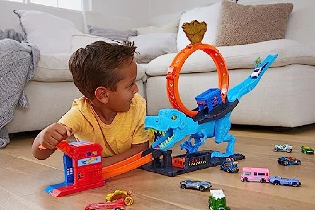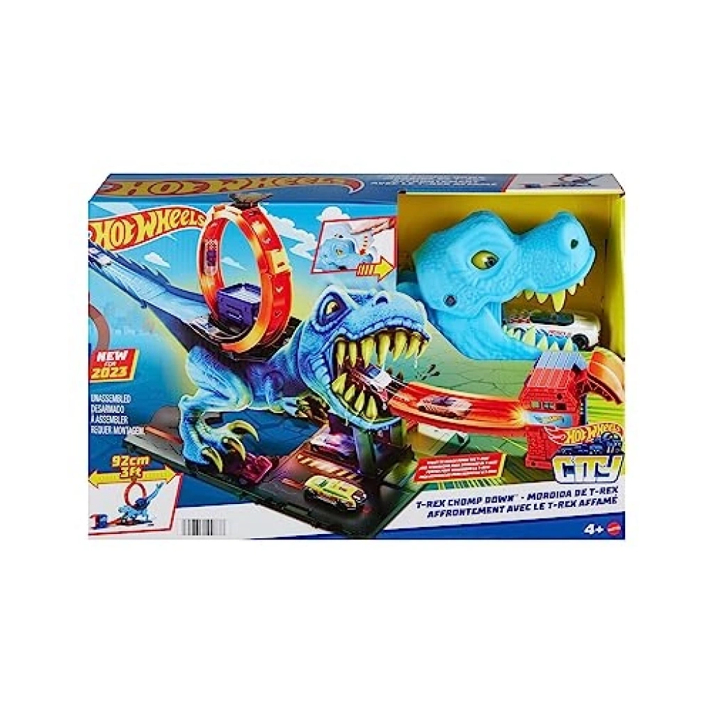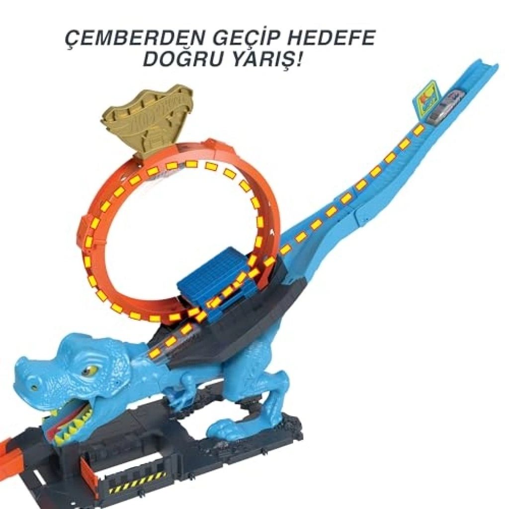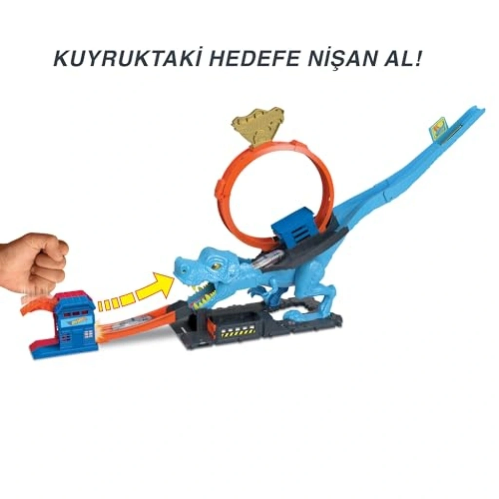 Dinozor ile Mücadele Oyun Seti, devasa T-Rex ile mücadele etme şansı sunar. Bu set, çocukların dahil olan Hot Wheels aracı ile dinozorun ağzından geçerek yarışmalarına olanak tanır. Doğru zamanlamayla dinozoru yenmek, çocuklara heyecan dolu bir deneyim sunar. Set, karakol temalı detaylarla zenginleştirilmiş olup, diğer setlerle birleştirilebilen pist yapısıyla yaratıcı hikayelere ilham verir.