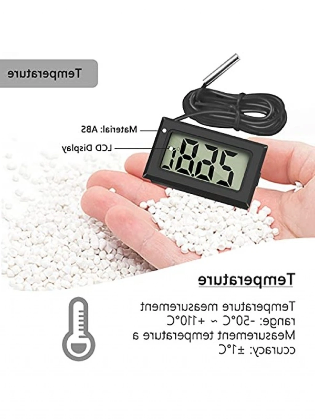 Dış mekan için tasarlanmış dijital LCD termometre, harici sensörü ile sıcaklık ölçümünü kolaylaştırır. -50°C ile +110°C arasında ölçüm yapabilen bu ürün, 48x28x15 mm boyutundadır. Su geçirmez prob tasarımı, hassas ölçüm imkanı sunar. LCD ekranı ile uzak mesafeden kolay okunabilir.