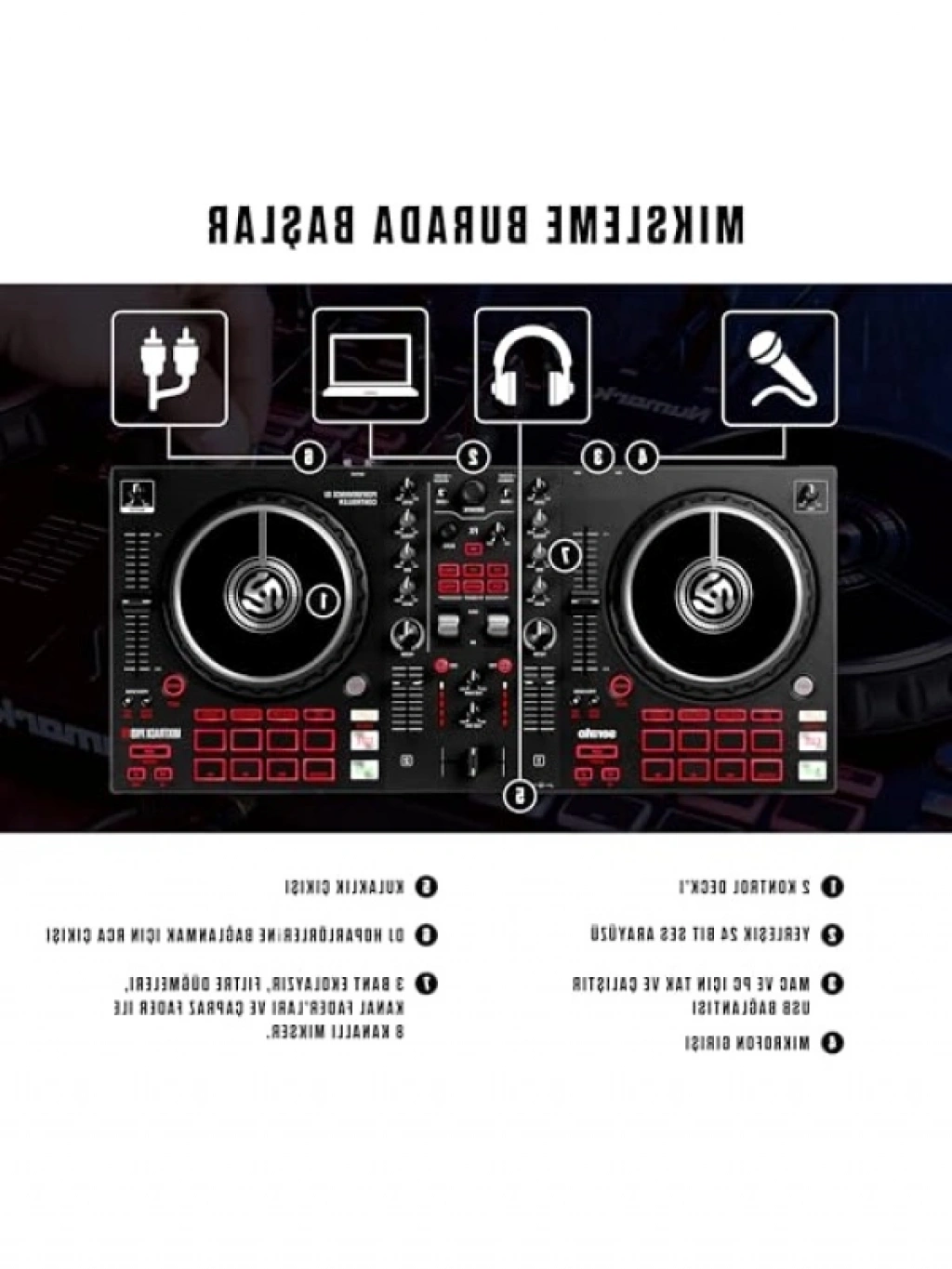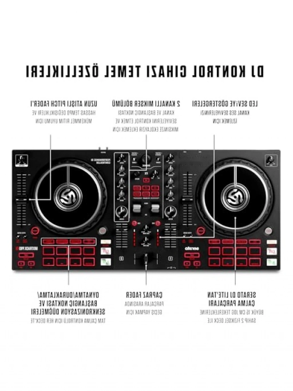 Bu DJ kontrolörü, acemiler için tasarlanmış komple bir sistemdir. 2 bölmeli yapısı ve dahili 24 bit ses kartı ile müzik mikslemede mükemmellik sunar. Mac ve PC ile uyumlu tak-çalıştır USB bağlantısı sayesinde kullanımı oldukça kolaydır. 6 inç kapasitif jog-wheel'ları, otantik bir turntable hissi verirken, hızlı efekt başlatma ve performans pedi ile DJ setinizi kişiselleştirmenizi sağlar. Milyonlarca şarkıyı Stream edebilme özelliği ile müziğinizi her an paylaşabilirsiniz.