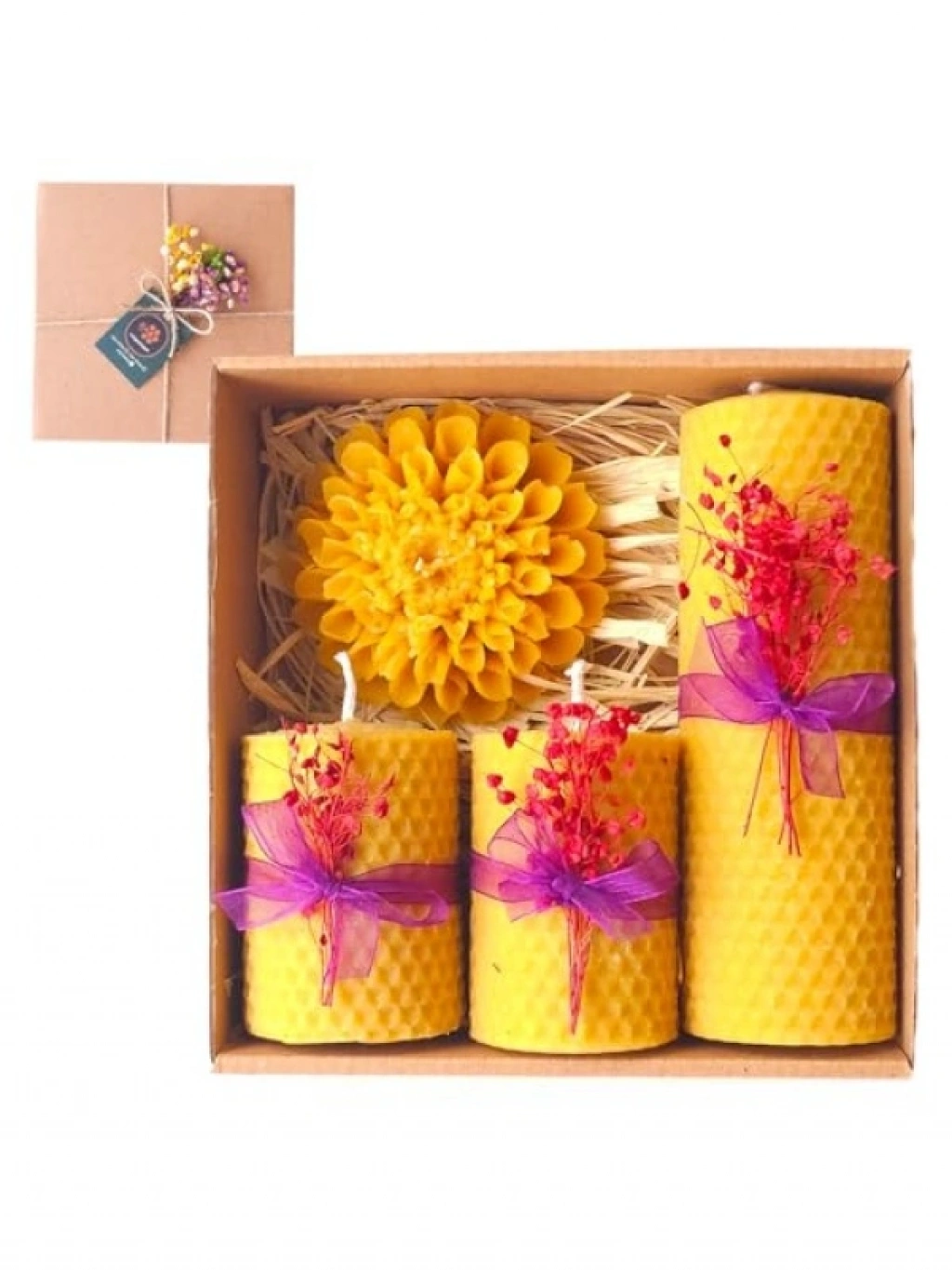 Bu 4 parçadan oluşan doğal balmumu mum seti, %100 doğal balmumundan üretilmiştir. Set içinde büyük çiçekli bir mum ve 3 adet farklı boyutlarda mum bulunmaktadır. Her bir mum, yanma sırasında doğal bal ve mum kokusu yayarak ortamınıza hoş bir atmosfer katar. Özel ambalajı ile güvenli bir şekilde gönderilir, doğal yapısıyla sağlığınıza zarar vermeyen bir alternatif sunar.