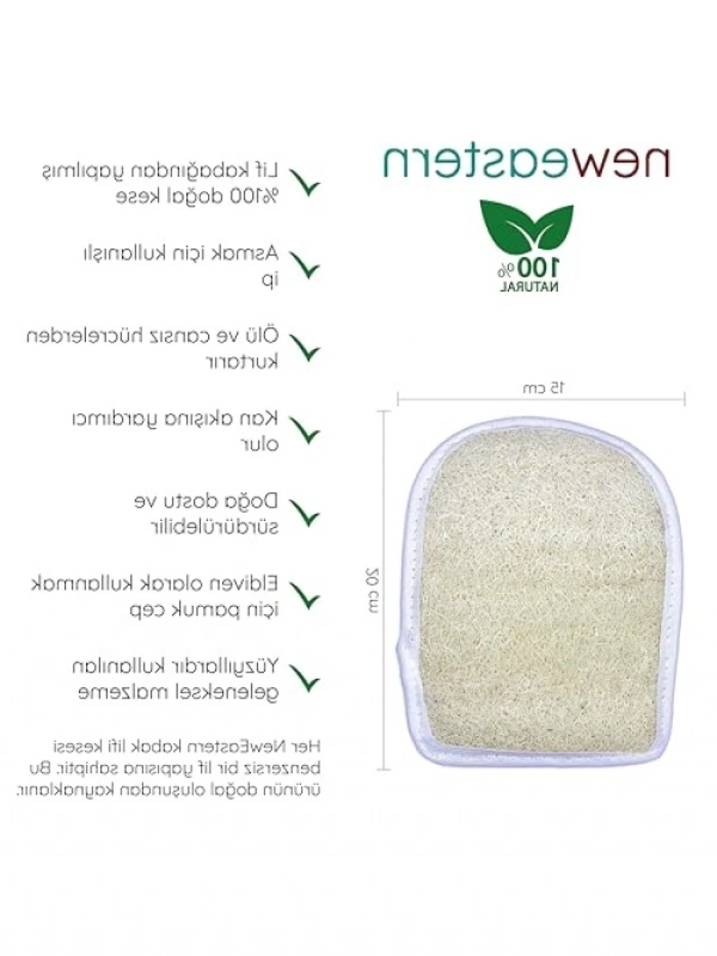 %100 doğal kabak lifi ile üretilen bu eldivenli kese, cildinizdeki ölü hücreleri arındırarak genç ve canlı görünüm elde etmenize yardımcı olur. Dairesel hareketlerle uygulandığında, kan dolaşımını artırarak cildinizin sağlıklı bir görünüm kazanmasına katkı sağlar. Duş jeli veya sabun ile birlikte kullanarak etkisini artırabilirsiniz. Doğal içerikleri sayesinde cildinize nazik bir bakım sunar.
