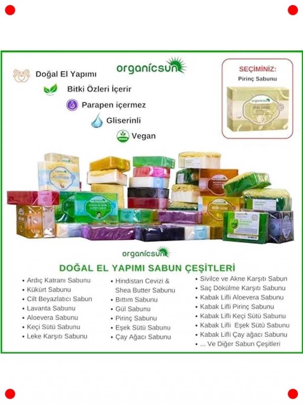 Tüm cilt tipleri için özel olarak formüle edilmiş bu 2 adetlik doğal pirinç sabunu seti, cildinizin doğal güzelliğini ortaya çıkarmak için tasarlandı. Pirinç özlerinin güçlü beyazlatıcı etkisi sayesinde cilt tonunuzu eşitlemeye ve daha aydınlık bir görünüm kazandırmaya yardımcı olur. Cildinizi nazikçe temizlerken, doğal nem dengesini korur ve kuruluk hissini engeller. Antioksidan özellikleriyle cildinizi serbest radikallerin zararlı etkilerinden korur. Düzenli kullanımda cildinizin daha pürüzsüz, yumuşak ve ışıltılı görünmesini sağlar. Yüz ve vücut kullanımına uygun bu sabunla sağlıklı ve bakımlı bir cilde kavuşun.